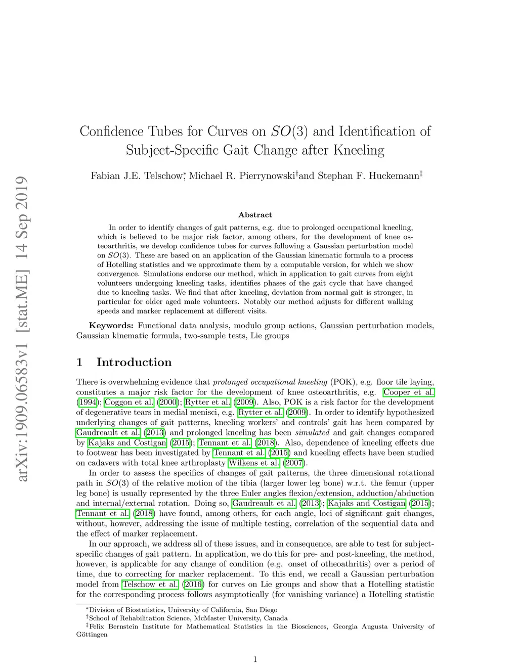 In order to identify changes of gait patterns, e.g. due to prolonged occupational kneeling, which is believed to be major risk factor, among others, for the development of knee osteoarthritis, we develop confidence tubes for curves following a Gaussian perturbation model on SO(3). These are based on an application of the Gaussian kinematic formula to a process of Hotelling statistics and we approximate them by a computible version, for which we show convergence. Simulations endorse our method, which in application to gait curves from eight volunteers undergoing kneeling tasks, identifies phases of the gait cycle that have changed due to kneeling tasks. We find that after kneeling, deviation from normal gait is stronger, in particular for older aged male volunteers. Notably our method adjusts for different walking speeds and marker replacement at different visits.
