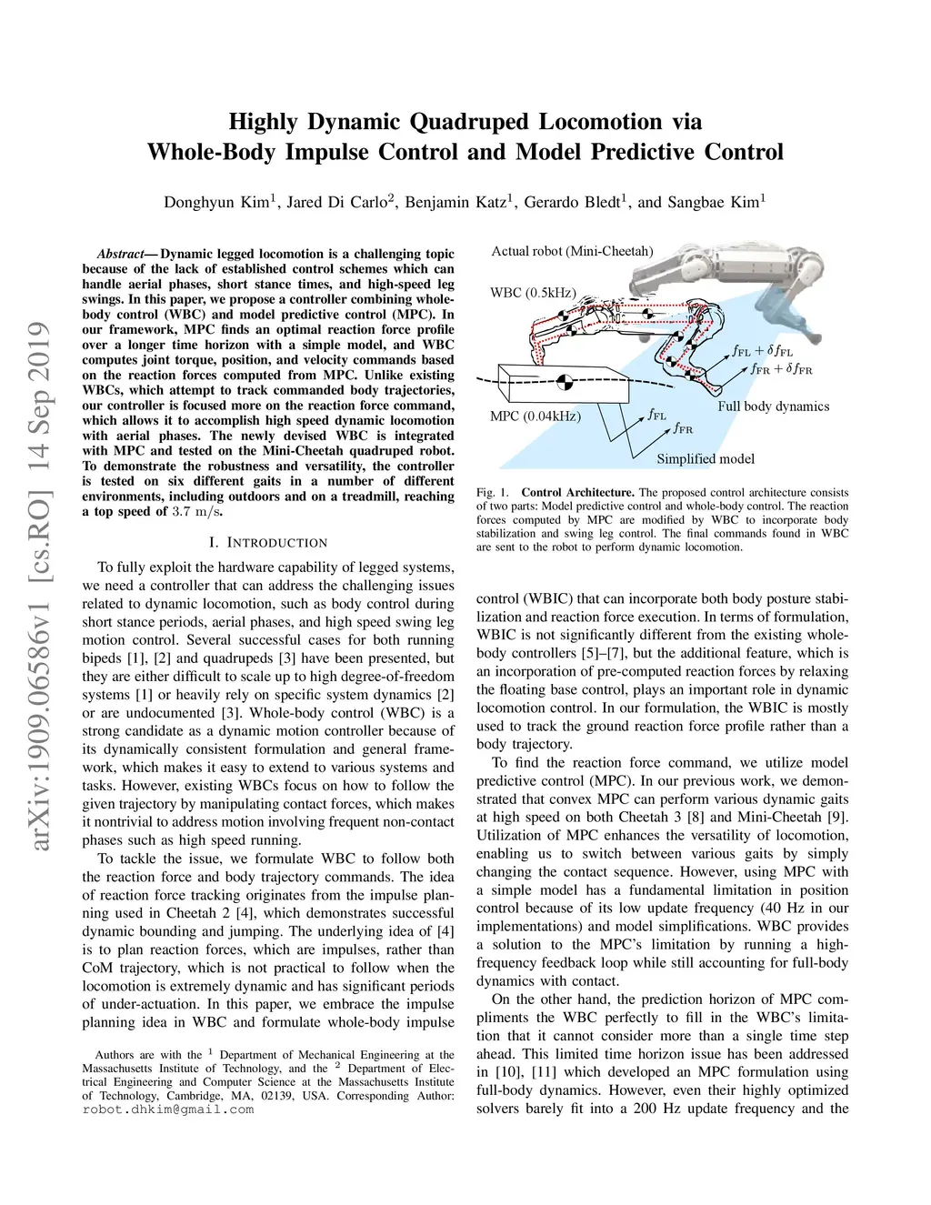 Dynamic legged locomotion is a challenging topic because of the lack of established control schemes which can handle aerial phases, short stance times, and high-speed leg swings. In this paper, we propose a controller combining whole-body control (WBC) and model predictive control (MPC). In our framework, MPC finds an optimal reaction force profile over a longer time horizon with a simple model, and WBC computes joint torque, position, and velocity commands based on the reaction forces computed from MPC. Unlike existing WBCs, which attempt to track commanded body trajectories, our controller is focused more on the reaction force command, which allows it to accomplish high speed dynamic locomotion with aerial phases. The newly devised WBC is integrated with MPC and tested on the Mini-Cheetah quadruped robot. To demonstrate the robustness and versatility, the controller is tested on six different gaits in a number of different environments, including outdoors and on a treadmill, reaching a top speed of 3.7 m/s.