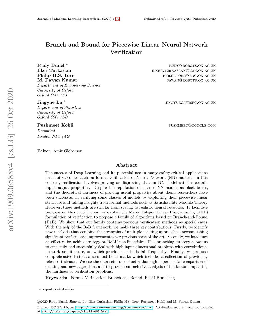 The success of Deep Learning and its potential use in many safety-critical applications has motivated research on formal verification of Neural Network (NN) models. In this context, verification involves proving or disproving that an NN model satisfies certain input-output properties. Despite the reputation of learned NN models as black boxes, and the theoretical hardness of proving useful properties about them, researchers have been successful in verifying some classes of models by exploiting their piecewise linear structure and taking insights from formal methods such as Satisifiability Modulo Theory. However, these methods are still far from scaling to realistic neural networks. To facilitate progress on this crucial area, we exploit the Mixed Integer Linear Programming (MIP) formulation of verification to propose a family of algorithms based on Branch-and-Bound (BaB). We show that our family contains previous verification methods as special cases. With the help of the BaB framework, we make three key contributions. Firstly, we identify new methods that combine the strengths of multiple existing approaches, accomplishing significant performance improvements over previous state of the art. Secondly, we introduce an effective branching strategy on ReLU non-linearities. This branching strategy allows us to efficiently and successfully deal with high input dimensional problems with convolutional network architecture, on which previous methods fail frequently. Finally, we propose comprehensive test data sets and benchmarks which includes a collection of previously released testcases. We use the data sets to conduct a thorough experimental comparison of existing and new algorithms and to provide an inclusive analysis of the factors impacting the hardness of verification problems.