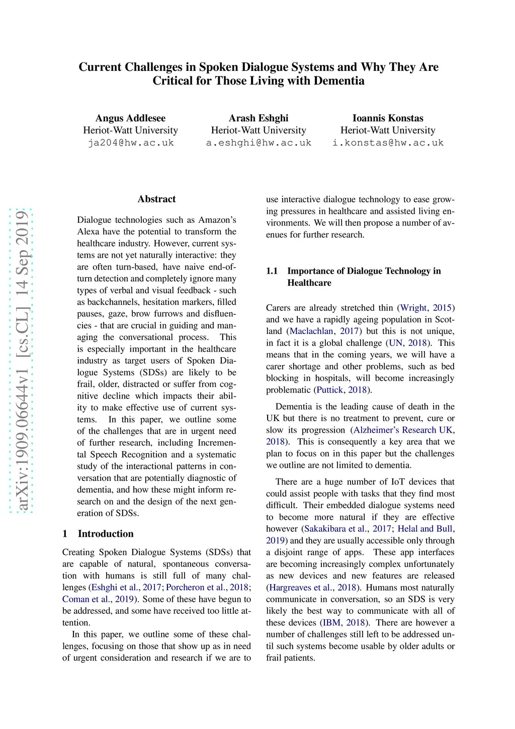 Dialogue technologies such as Amazon's Alexa have the potential to transform the healthcare industry. However, current systems are not yet naturally interactive: they are often turn-based, have naive end-of-turn detection and completely ignore many types of verbal and visual feedback - such as backchannels, hesitation markers, filled pauses, gaze, brow furrows and disfluencies - that are crucial in guiding and managing the conversational process. This is especially important in the healthcare industry as target users of Spoken Dialogue Systems (SDSs) are likely to be frail, older, distracted or suffer from cognitive decline which impacts their ability to make effective use of current systems. In this paper, we outline some of the challenges that are in urgent need of further research, including Incremental Speech Recognition and a systematic study of the interactional patterns in conversation that are potentially diagnostic of dementia, and how these might inform research on and the design of the next generation of SDSs.
