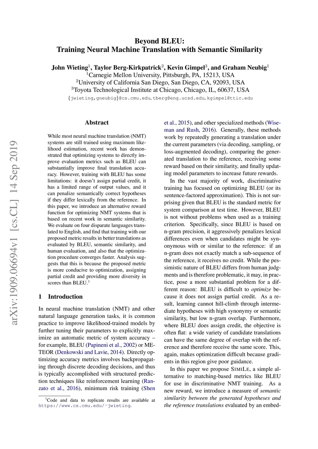 While most neural machine translation (NMT) systems are still trained using maximum likelihood estimation, recent work has demonstrated that optimizing systems to directly improve evaluation metrics such as BLEU can substantially improve final translation accuracy. However, training with BLEU has some limitations: it doesn't assign partial credit, it has a limited range of output values, and it can penalize semantically correct hypotheses if they differ lexically from the reference. In this paper, we introduce an alternative reward function for optimizing NMT systems that is based on recent work in semantic similarity. We evaluate on four disparate languages translated to English, and find that training with our proposed metric results in better translations as evaluated by BLEU, semantic similarity, and human evaluation, and also that the optimization procedure converges faster. Analysis suggests that this is because the proposed metric is more conducive to optimization, assigning partial credit and providing more diversity in scores than BLEU.