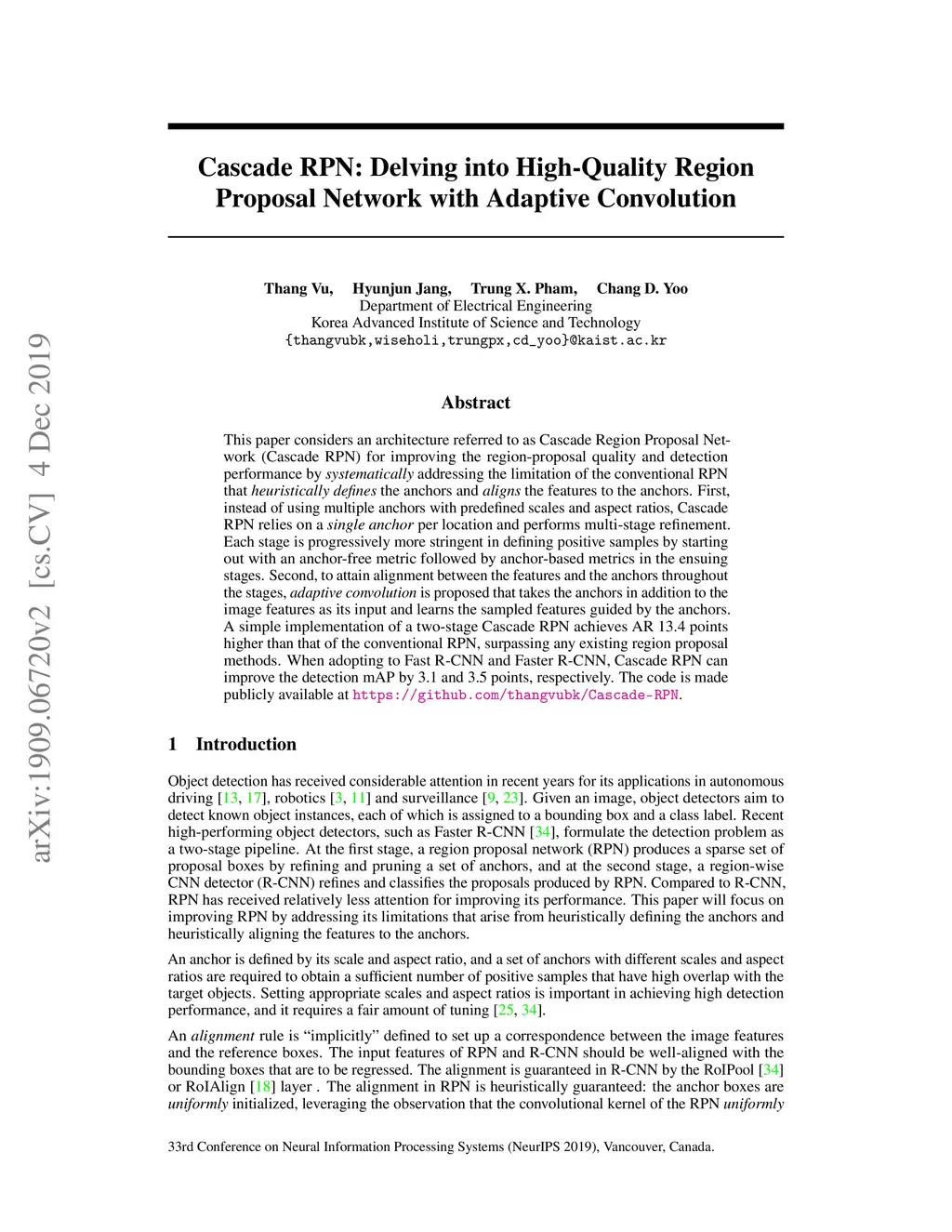 This paper considers an architecture referred to as Cascade Region Proposal Network (Cascade RPN) for improving the region-proposal quality and detection performance by \textit{systematically} addressing the limitation of the conventional RPN that \textit{heuristically defines} the anchors and \textit{aligns} the features to the anchors. First, instead of using multiple anchors with predefined scales and aspect ratios, Cascade RPN relies on a \textit{single anchor} per location and performs multi-stage refinement. Each stage is progressively more stringent in defining positive samples by starting out with an anchor-free metric followed by anchor-based metrics in the ensuing stages. Second, to attain alignment between the features and the anchors throughout the stages, \textit{adaptive convolution} is proposed that takes the anchors in addition to the image features as its input and learns the sampled features guided by the anchors. A simple implementation of a two-stage Cascade RPN achieves AR 13.4 points higher than that of the conventional RPN, surpassing any existing region proposal methods. When adopting to Fast R-CNN and Faster R-CNN, Cascade RPN can improve the detection mAP by 3.1 and 3.5 points, respectively. The code is made publicly available at \url{https://github.com/thangvubk/Cascade-RPN.git}.