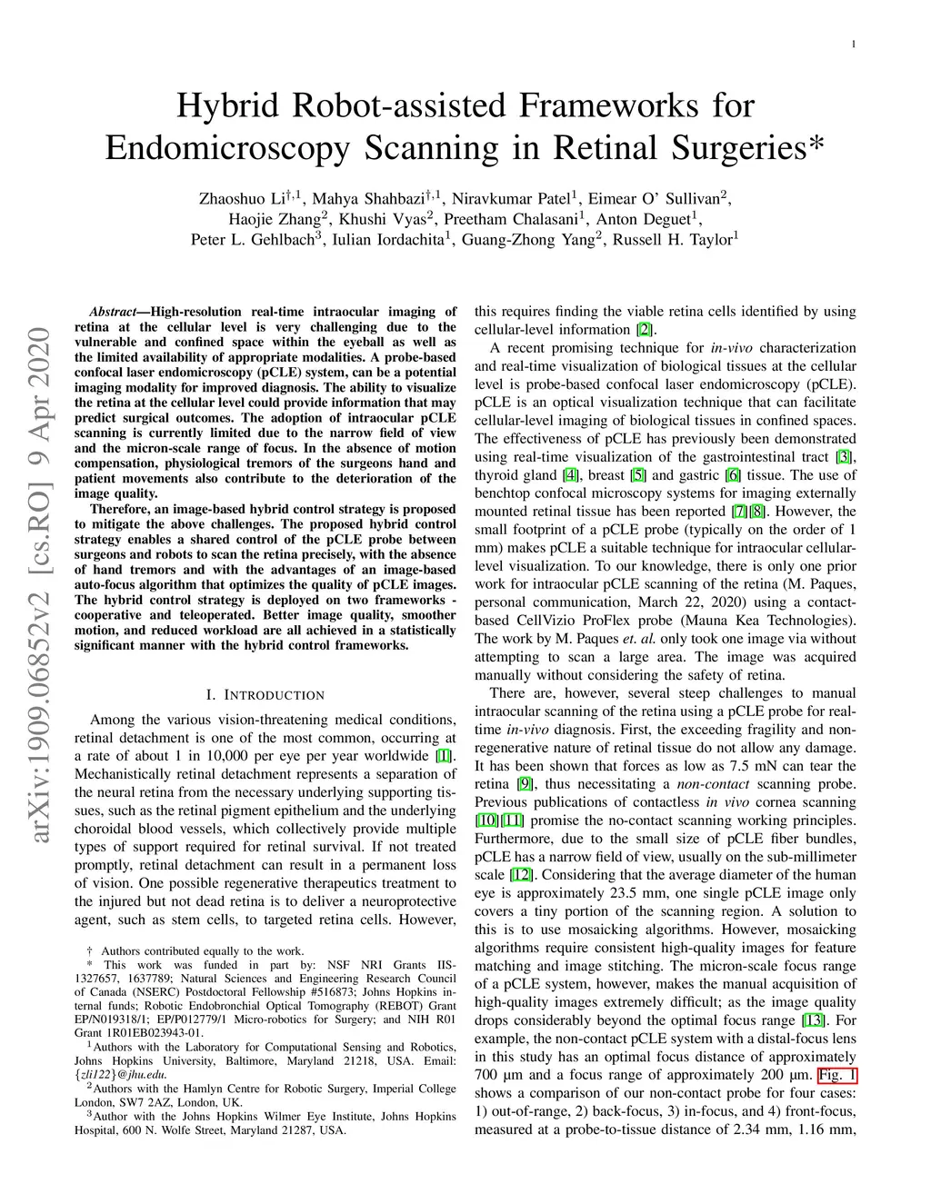 High-resolution real-time intraocular imaging of retina at the cellular level is very challenging due to the vulnerable and confined space within the eyeball as well as the limited availability of appropriate modalities. A probe-based confocal laser endomicroscopy (pCLE) system, can be a potential imaging modality for improved diagnosis. The ability to visualize the retina at the cellular level could provide information that may predict surgical outcomes. The adoption of intraocular pCLE scanning is currently limited due to the narrow field of view and the micron-scale range of focus. In the absence of motion compensation, physiological tremors of the surgeons' hand and patient movements also contribute to the deterioration of the image quality. Therefore, an image-based hybrid control strategy is proposed to mitigate the above challenges. The proposed hybrid control strategy enables a shared control of the pCLE probe between surgeons and robots to scan the retina precisely, with the absence of hand tremors and with the advantages of an image-based auto-focus algorithm that optimizes the quality of pCLE images. The hybrid control strategy is deployed on two frameworks - cooperative and teleoperated. Better image quality, smoother motion, and reduced workload are all achieved in a statistically significant manner with the hybrid control frameworks.