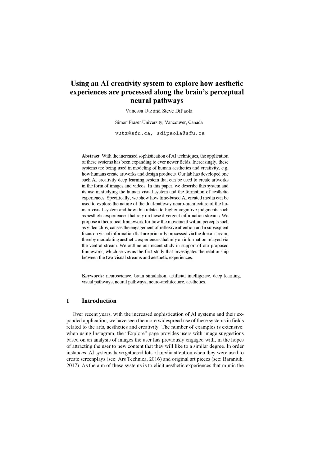 With the increased sophistication of AI techniques, the application of these systems has been expanding to ever newer fields. Increasingly, these systems are being used in modeling of human aesthetics and creativity, e.g. how humans create artworks and design products. Our lab has developed one such AI creativity deep learning system that can be used to create artworks in the form of images and videos. In this paper, we describe this system and its use in studying the human visual system and the formation of aesthetic experiences. Specifically, we show how time-based AI created media can be used to explore the nature of the dual-pathway neuro-architecture of the human visual system and how this relates to higher cognitive judgments such as aesthetic experiences that rely on these divergent information streams. We propose a theoretical framework for how the movement within percepts such as video clips, causes the engagement of reflexive attention and a subsequent focus on visual information that are primarily processed via the dorsal stream, thereby modulating aesthetic experiences that rely on information relayed via the ventral stream. We outline our recent study in support of our proposed framework, which serves as the first study that investigates the relationship between the two visual streams and aesthetic experiences.