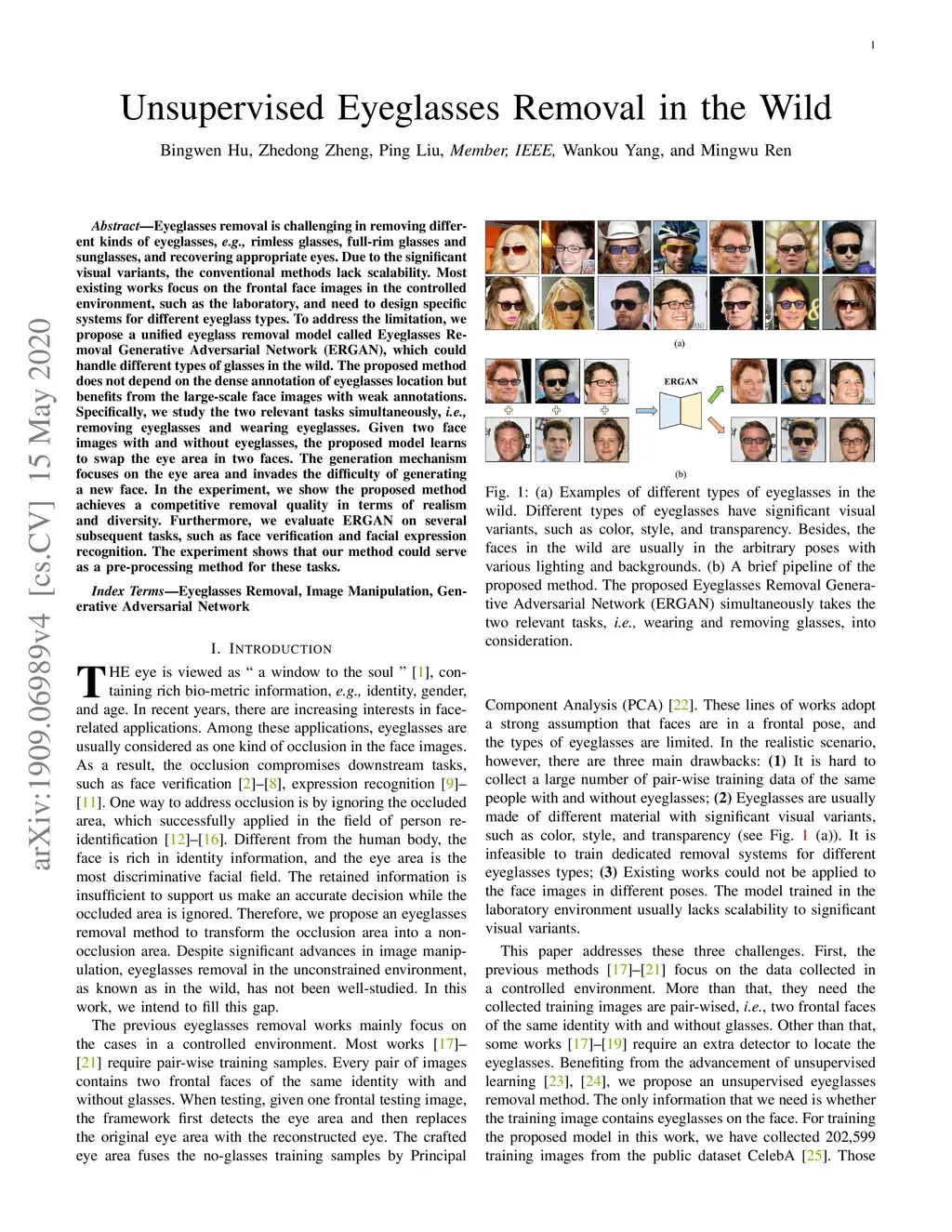 Eyeglasses removal is challenging in removing different kinds of eyeglasses, e.g., rimless glasses, full-rim glasses and sunglasses, and recovering appropriate eyes. Due to the large visual variants, the conventional methods lack scalability. Most existing works focus on the frontal face images in the controlled environment, such as the laboratory, and need to design specific systems for different eyeglass types. To address the limitation, we propose a unified eyeglass removal model called Eyeglasses Removal Generative Adversarial Network (ERGAN), which could handle different types of glasses in the wild. The proposed method does not depend on the dense annotation of eyeglasses location but benefits from the large-scale face images with weak annotations. Specifically, we study the two relevant tasks simultaneously, i.e., removing and wearing eyeglasses. Given two facial images with and without eyeglasses, the proposed model learns to swap the eye area in two faces. The generation mechanism focuses on the eye area and invades the difficulty of generating a new face. In the experiment, we show the proposed method achieves a competitive removal quality in terms of realism and diversity. Furthermore, we evaluate ERGAN on several subsequent tasks, such as face verification and facial expression recognition. The experiment shows that our method could serve as a pre-processing method for these tasks.