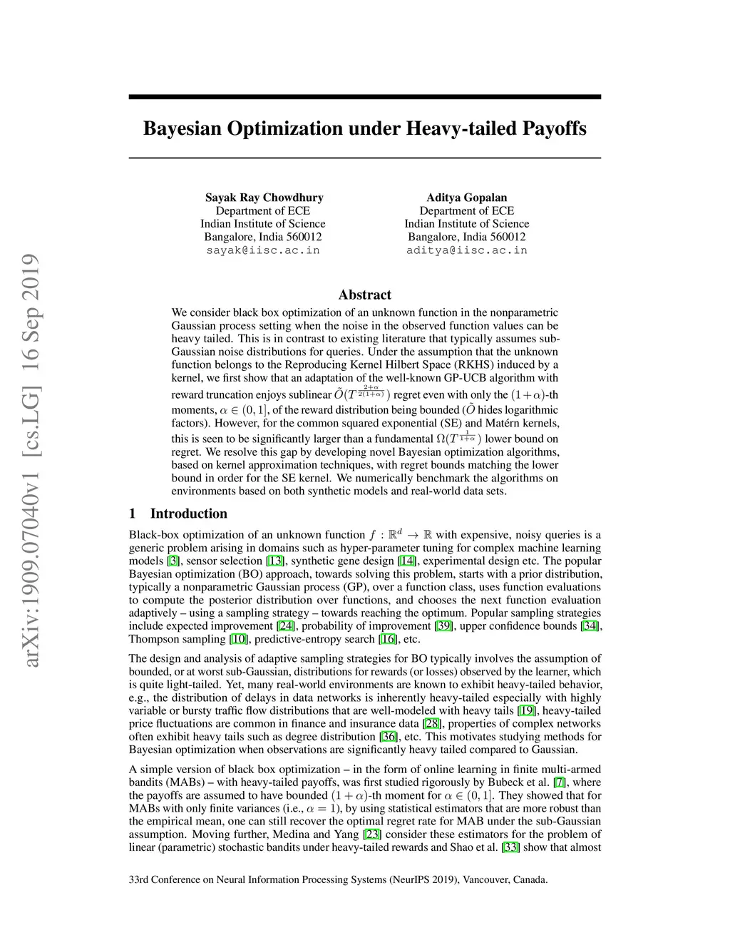 We consider black box optimization of an unknown function in the nonparametric Gaussian process setting when the noise in the observed function values can be heavy tailed. This is in contrast to existing literature that typically assumes sub-Gaussian noise distributions for queries. Under the assumption that the unknown function belongs to the Reproducing Kernel Hilbert Space (RKHS) induced by a kernel, we first show that an adaptation of the well-known GP-UCB algorithm with reward truncation enjoys sublinear regret even with only the -th moments, , of the reward distribution being bounded ( hides logarithmic factors). However, for the common squared exponential (SE) and Mat\'{e}rn kernels, this is seen to be significantly larger than a fundamental lower bound on regret. We resolve this gap by developing novel Bayesian optimization algorithms, based on kernel approximation techniques, with regret bounds matching the lower bound in order for the SE kernel. We numerically benchmark the algorithms on environments based on both synthetic models and real-world data sets.
