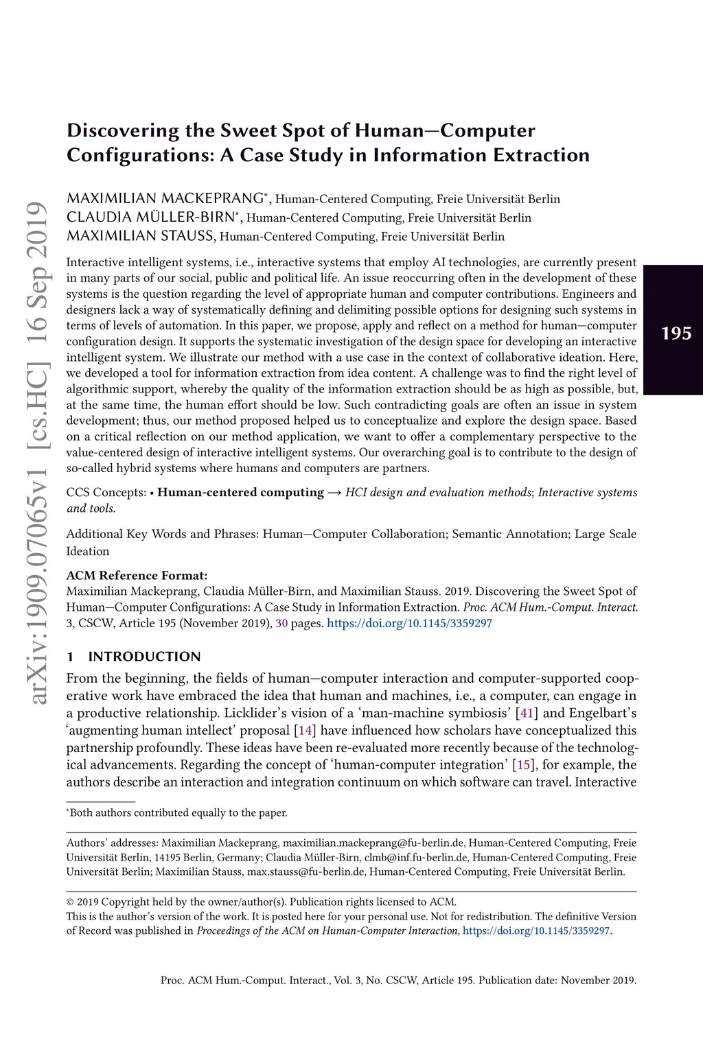 Interactive intelligent systems, i.e., interactive systems that employ AI technologies, are currently present in many parts of our social, public and political life. An issue reoccurring often in the development of these systems is the question regarding the level of appropriate human and computer contributions. Engineers and designers lack a way of systematically defining and delimiting possible options for designing such systems in terms of levels of automation. In this paper, we propose, apply and reflect on a method for human-computer configuration design. It supports the systematic investigation of the design space for developing an interactive intelligent system. We illustrate our method with a use case in the context of collaborative ideation. Here, we developed a tool for information extraction from idea content. A challenge was to find the right level of algorithmic support, whereby the quality of the information extraction should be as high as possible, but, at the same time, the human effort should be low. Such contradicting goals are often an issue in system development; thus, our method proposed helped us to conceptualize and explore the design space. Based on a critical reflection on our method application, we want to offer a complementary perspective to the value-centered design of interactive intelligent systems. Our overarching goal is to contribute to the design of so-called hybrid systems where humans and computers are partners.