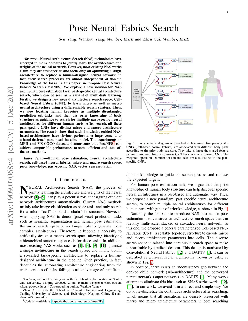 Neural Architecture Search (NAS) technologies have emerged in many domains to jointly learn the architectures and weights of the neural network. However, most existing NAS works claim they are task-specific and focus only on optimizing a single architecture to replace a human-designed neural network, in fact, their search processes are almost independent of domain knowledge of the tasks. In this paper, we propose Pose Neural Fabrics Search (PoseNFS). We explore a new solution for NAS and human pose estimation task: part-specific neural architecture search, which can be seen as a variant of multi-task learning. Firstly, we design a new neural architecture search space, Cell-based Neural Fabric (CNF), to learn micro as well as macro neural architecture using a differentiable search strategy. Then, we view locating human keypoints as multiple disentangled prediction sub-tasks, and then use prior knowledge of body structure as guidance to search for multiple part-specific neural architectures for different human parts. After search, all these part-specific CNFs have distinct micro and macro architecture parameters. The results show that such knowledge-guided NAS-based architectures have obvious performance improvements to a hand-designed part-based baseline model. The experiments on MPII and MS-COCO datasets demonstrate that PoseNFS\footnote{Code is available at \url{https://github.com/yangsenius/PoseNFS}} can achieve comparable performance to some efficient and state-of-the-art methods.