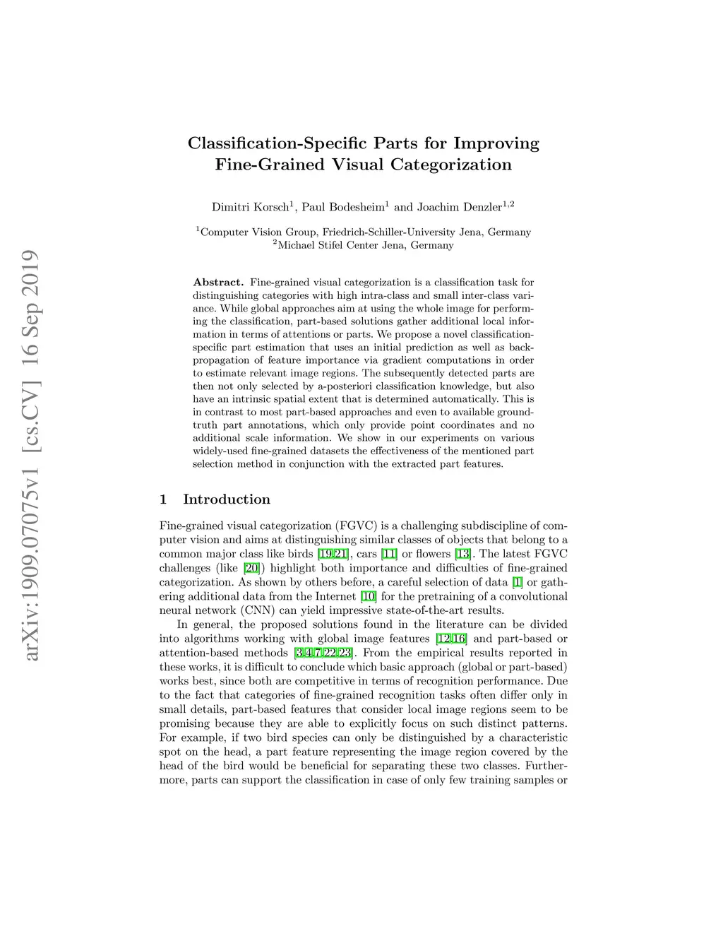 Fine-grained visual categorization is a classification task for distinguishing categories with high intra-class and small inter-class variance. While global approaches aim at using the whole image for performing the classification, part-based solutions gather additional local information in terms of attentions or parts. We propose a novel classification-specific part estimation that uses an initial prediction as well as back-propagation of feature importance via gradient computations in order to estimate relevant image regions. The subsequently detected parts are then not only selected by a-posteriori classification knowledge, but also have an intrinsic spatial extent that is determined automatically. This is in contrast to most part-based approaches and even to available ground-truth part annotations, which only provide point coordinates and no additional scale information. We show in our experiments on various widely-used fine-grained datasets the effectiveness of the mentioned part selection method in conjunction with the extracted part features.