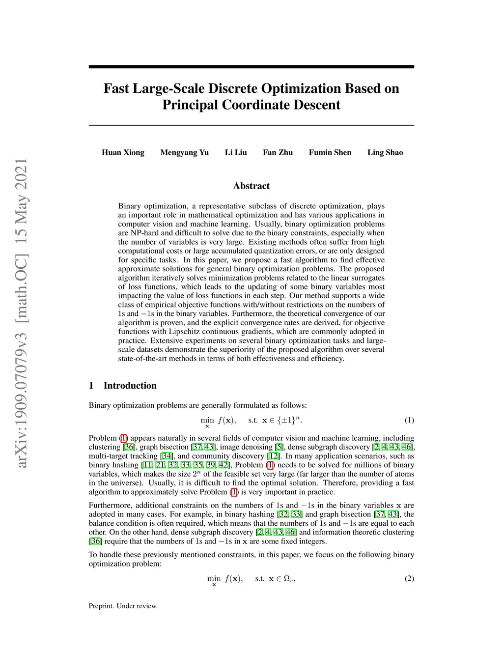 Fast Large-Scale Discrete Optimization Based on Principal Coordinate