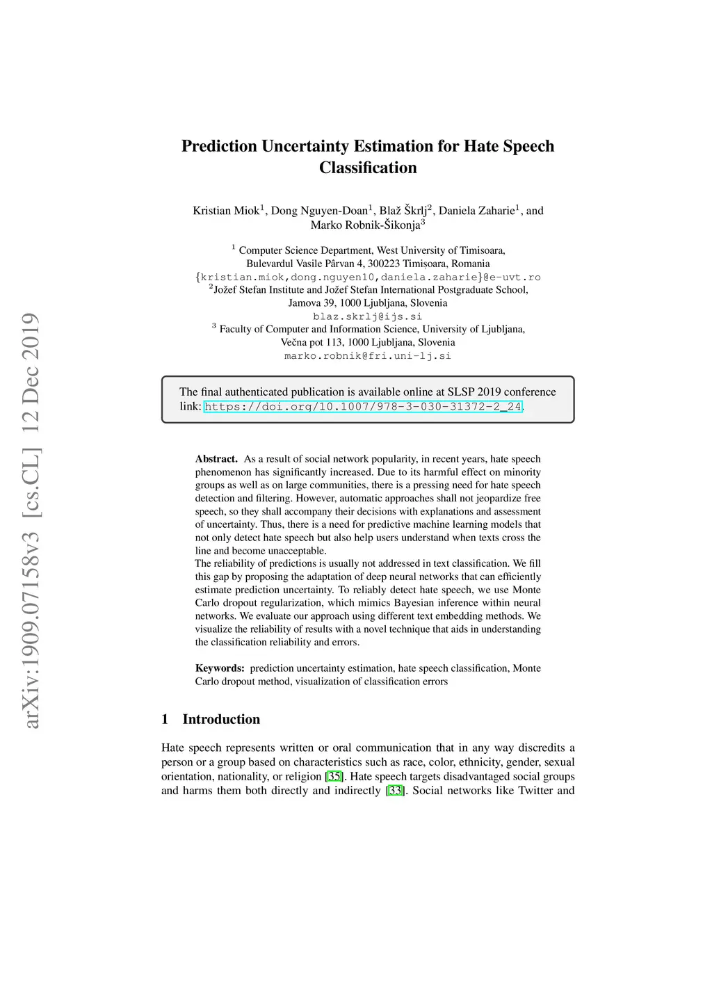 As a result of social network popularity, in recent years, hate speech phenomenon has significantly increased. Due to its harmful effect on minority groups as well as on large communities, there is a pressing need for hate speech detection and filtering. However, automatic approaches shall not jeopardize free speech, so they shall accompany their decisions with explanations and assessment of uncertainty. Thus, there is a need for predictive machine learning models that not only detect hate speech but also help users understand when texts cross the line and become unacceptable. The reliability of predictions is usually not addressed in text classification. We fill this gap by proposing the adaptation of deep neural networks that can efficiently estimate prediction uncertainty. To reliably detect hate speech, we use Monte Carlo dropout regularization, which mimics Bayesian inference within neural networks. We evaluate our approach using different text embedding methods. We visualize the reliability of results with a novel technique that aids in understanding the classification reliability and errors.
