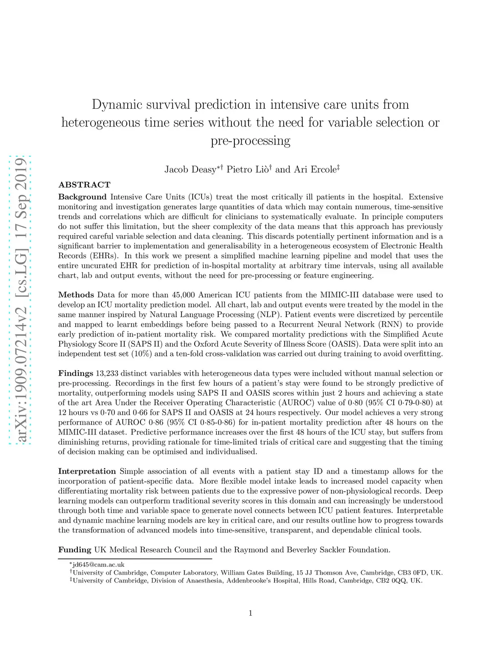 We present a machine learning pipeline and model that uses the entire uncurated EHR for prediction of in-hospital mortality at arbitrary time intervals, using all available chart, lab and output events, without the need for pre-processing or feature engineering. Data for more than 45,000 American ICU patients from the MIMIC-III database were used to develop an ICU mortality prediction model. All chart, lab and output events were treated by the model in the same manner inspired by Natural Language Processing (NLP). Patient events were discretized by percentile and mapped to learnt embeddings before being passed to a Recurrent Neural Network (RNN) to provide early prediction of in-patient mortality risk. We compared mortality predictions with the Simplified Acute Physiology Score II (SAPS II) and the Oxford Acute Severity of Illness Score (OASIS). Data were split into an independent test set (10%) and a ten-fold cross-validation was carried out during training to avoid overfitting. 13,233 distinct variables with heterogeneous data types were included without manual selection or pre-processing. Recordings in the first few hours of a patient's stay were found to be strongly predictive of mortality, outperforming models using SAPS II and OASIS scores within just 2 hours and achieving a state of the art Area Under the Receiver Operating Characteristic (AUROC) value of 0.80 (95% CI 0.79-0.80) at 12 hours vs 0.70 and 0.66 for SAPS II and OASIS at 24 hours respectively. Our model achieves a very strong performance of AUROC 0.86 (95% CI 0.85-0.86) for in-patient mortality prediction after 48 hours on the MIMIC-III dataset. Predictive performance increases over the first 48 hours of the ICU stay, but suffers from diminishing returns, providing rationale for time-limited trials of critical care and suggesting that the timing of decision making can be optimised and individualised.