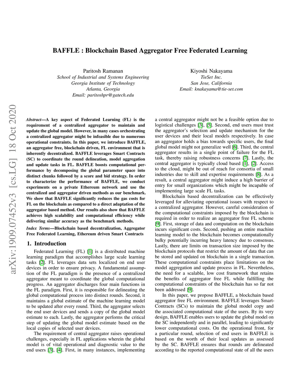 BAFFLE : Blockchain Based Aggregator Free Federated Learning
