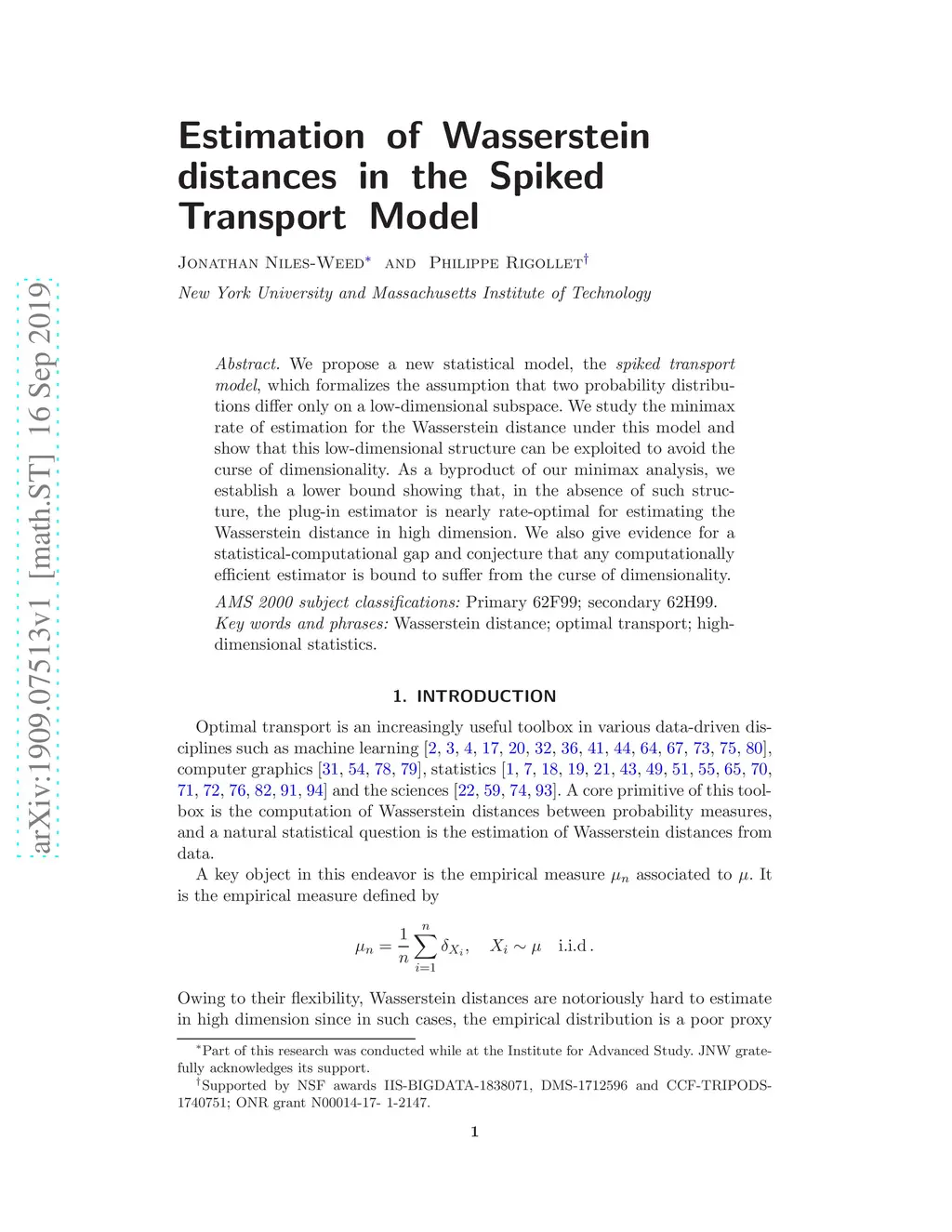 We propose a new statistical model, the spiked transport model, which formalizes the assumption that two probability distributions differ only on a low-dimensional subspace. We study the minimax rate of estimation for the Wasserstein distance under this model and show that this low-dimensional structure can be exploited to avoid the curse of dimensionality. As a byproduct of our minimax analysis, we establish a lower bound showing that, in the absence of such structure, the plug-in estimator is nearly rate-optimal for estimating the Wasserstein distance in high dimension. We also give evidence for a statistical-computational gap and conjecture that any computationally efficient estimator is bound to suffer from the curse of dimensionality.