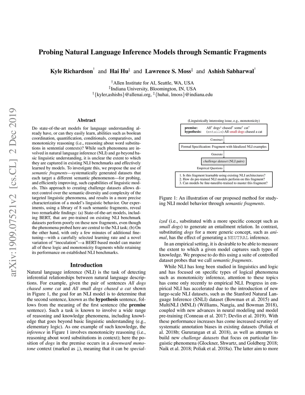 Do state-of-the-art models for language understanding already have, or can they easily learn, abilities such as boolean coordination, quantification, conditionals, comparatives, and monotonicity reasoning (i.e., reasoning about word substitutions in sentential contexts)? While such phenomena are involved in natural language inference (NLI) and go beyond basic linguistic understanding, it is unclear the extent to which they are captured in existing NLI benchmarks and effectively learned by models. To investigate this, we propose the use of semantic fragments---systematically generated datasets that each target a different semantic phenomenon---for probing, and efficiently improving, such capabilities of linguistic models. This approach to creating challenge datasets allows direct control over the semantic diversity and complexity of the targeted linguistic phenomena, and results in a more precise characterization of a model's linguistic behavior. Our experiments, using a library of 8 such semantic fragments, reveal two remarkable findings: (a) State-of-the-art models, including BERT, that are pre-trained on existing NLI benchmark datasets perform poorly on these new fragments, even though the phenomena probed here are central to the NLI task. (b) On the other hand, with only a few minutes of additional fine-tuning---with a carefully selected learning rate and a novel variation of "inoculation"---a BERT-based model can master all of these logic and monotonicity fragments while retaining its performance on established NLI benchmarks.
