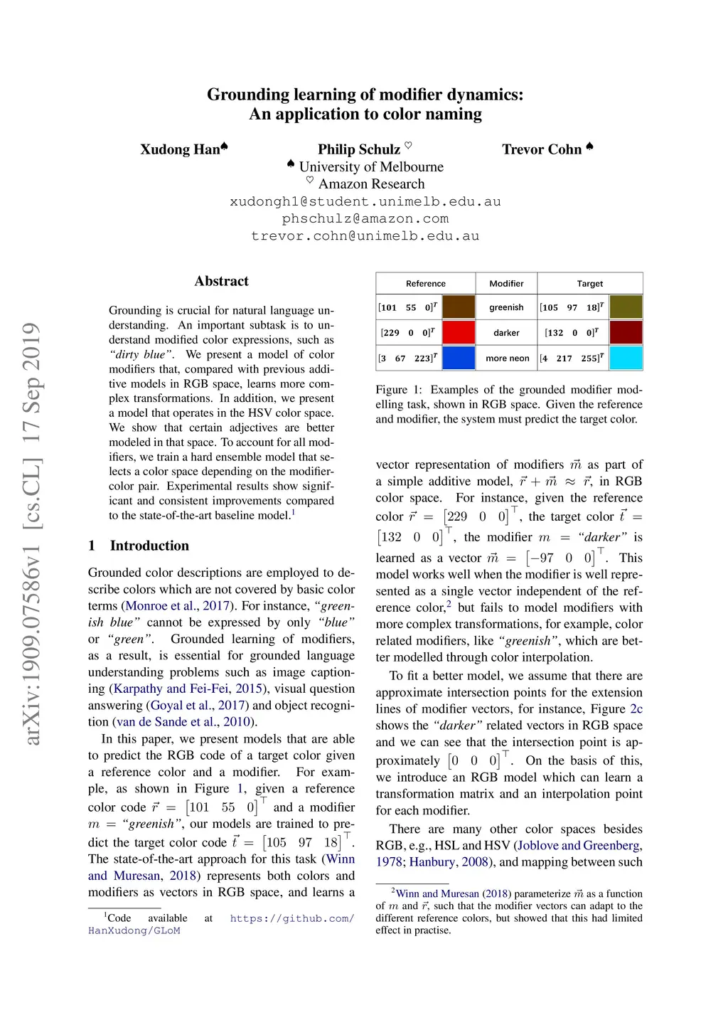 Grounding is crucial for natural language understanding. An important subtask is to understand modified color expressions, such as 'dirty blue'. We present a model of color modifiers that, compared with previous additive models in RGB space, learns more complex transformations. In addition, we present a model that operates in the HSV color space. We show that certain adjectives are better modeled in that space. To account for all modifiers, we train a hard ensemble model that selects a color space depending on the modifier color pair. Experimental results show significant and consistent improvements compared to the state-of-the-art baseline model.
