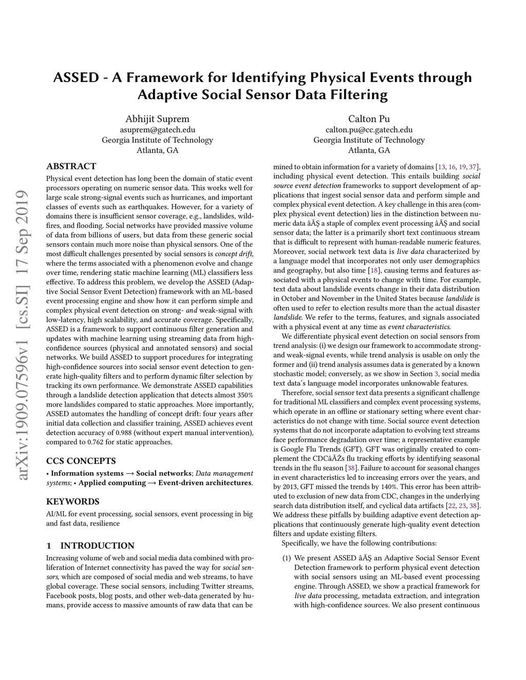 Physical event detection has long been the domain of static event processors operating on numeric sensor data. This works well for large scale strong-signal events such as hurricanes, and important classes of events such as earthquakes. However, for a variety of domains there is insufficient sensor coverage, e.g., landslides, wildfires, and flooding. Social networks have provided massive volume of data from billions of users, but data from these generic social sensors contain much more noise than physical sensors. One of the most difficult challenges presented by social sensors is \textit{concept drift}, where the terms associated with a phenomenon evolve and change over time, rendering static machine learning (ML) classifiers less effective. To address this problem, we develop the ASSED (Adaptive Social Sensor Event Detection) framework with an ML-based event processing engine and show how it can perform simple and complex physical event detection on strong- \textit{and} weak-signal with low-latency, high scalability, and accurate coverage. Specifically, ASSED is a framework to support continuous filter generation and updates with machine learning using streaming data from high-confidence sources (physical and annotated sensors) and social networks. We build ASSED to support procedures for integrating high-confidence sources into social sensor event detection to generate high-quality filters and to perform dynamic filter selection by tracking its own performance. We demonstrate ASSED capabilities through a landslide detection application that detects almost 350\% more landslides compared to static approaches. More importantly, ASSED automates the handling of concept drift: four years after initial data collection and classifier training, ASSED achieves event detection accuracy of 0.988 (without expert manual intervention), compared to 0.762 for static approaches.