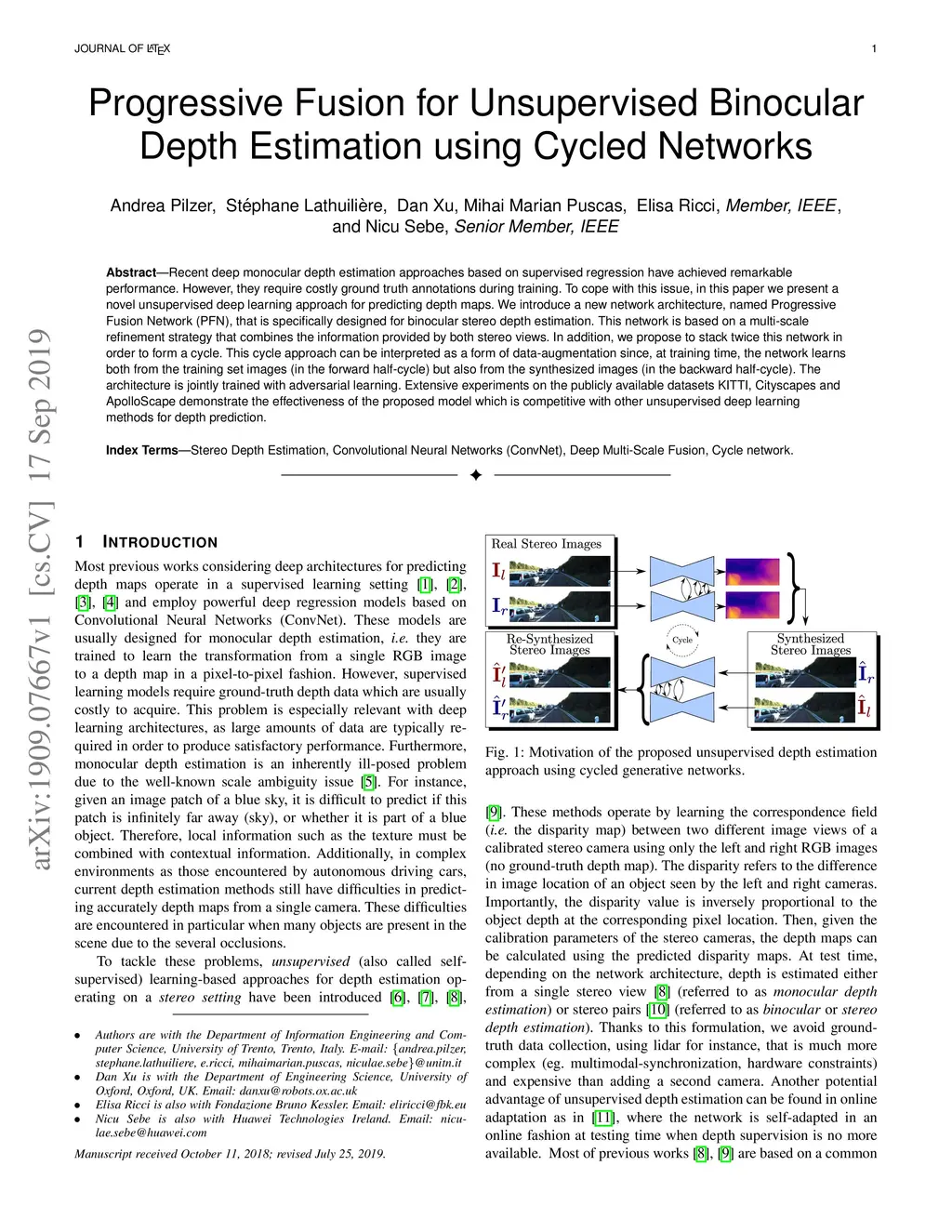 Progressive Fusion for Unsupervised Binocular Depth Estimation using