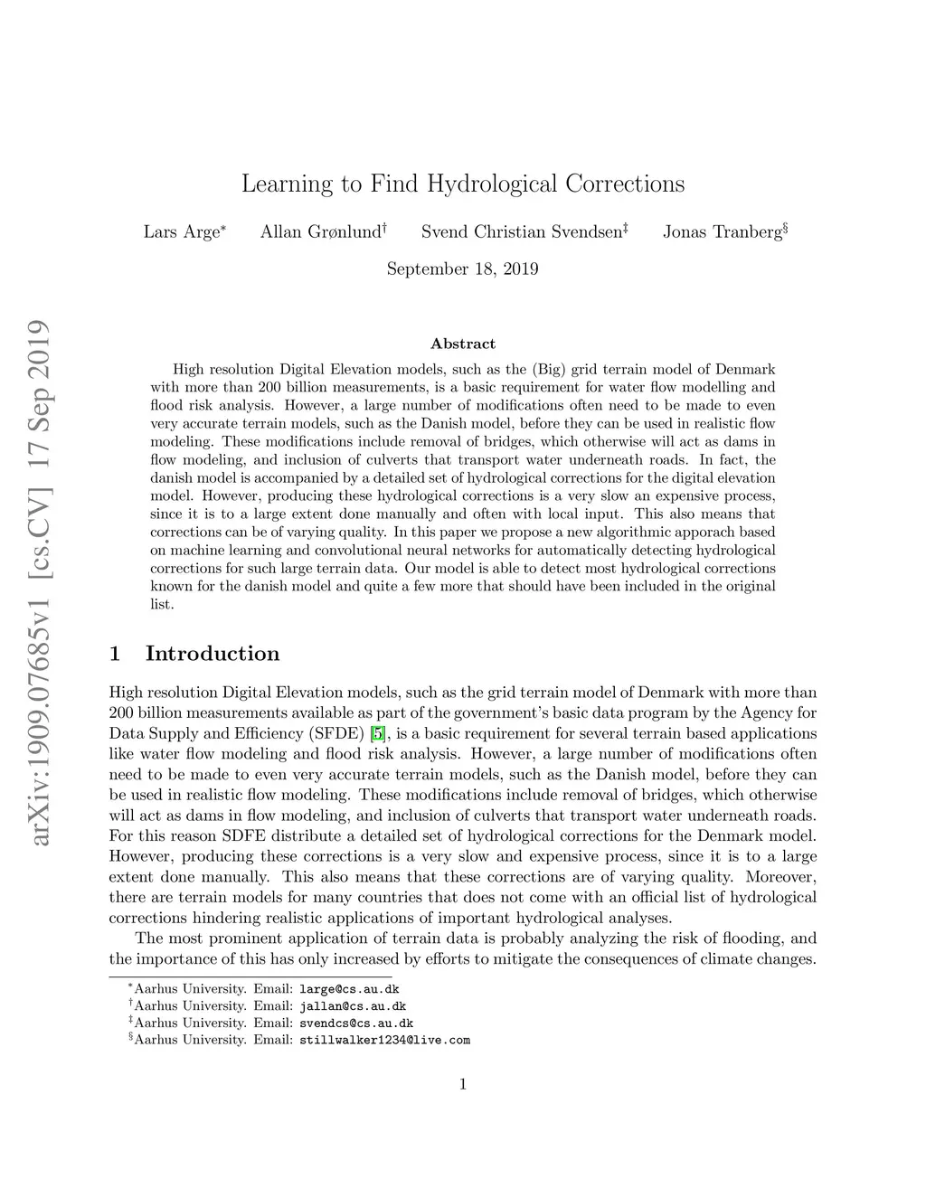High resolution Digital Elevation models, such as the (Big) grid terrain model of Denmark with more than 200 billion measurements, is a basic requirement for water flow modelling and flood risk analysis. However, a large number of modifications often need to be made to even very accurate terrain models, such as the Danish model, before they can be used in realistic flow modeling. These modifications include removal of bridges, which otherwise will act as dams in flow modeling, and inclusion of culverts that transport water underneath roads. In fact, the danish model is accompanied by a detailed set of hydrological corrections for the digital elevation model. However, producing these hydrological corrections is a very slow an expensive process, since it is to a large extent done manually and often with local input. This also means that corrections can be of varying quality. In this paper we propose a new algorithmic apporach based on machine learning and convolutional neural networks for automatically detecting hydrological corrections for such large terrain data. Our model is able to detect most hydrological corrections known for the danish model and quite a few more that should have been included in the original list.