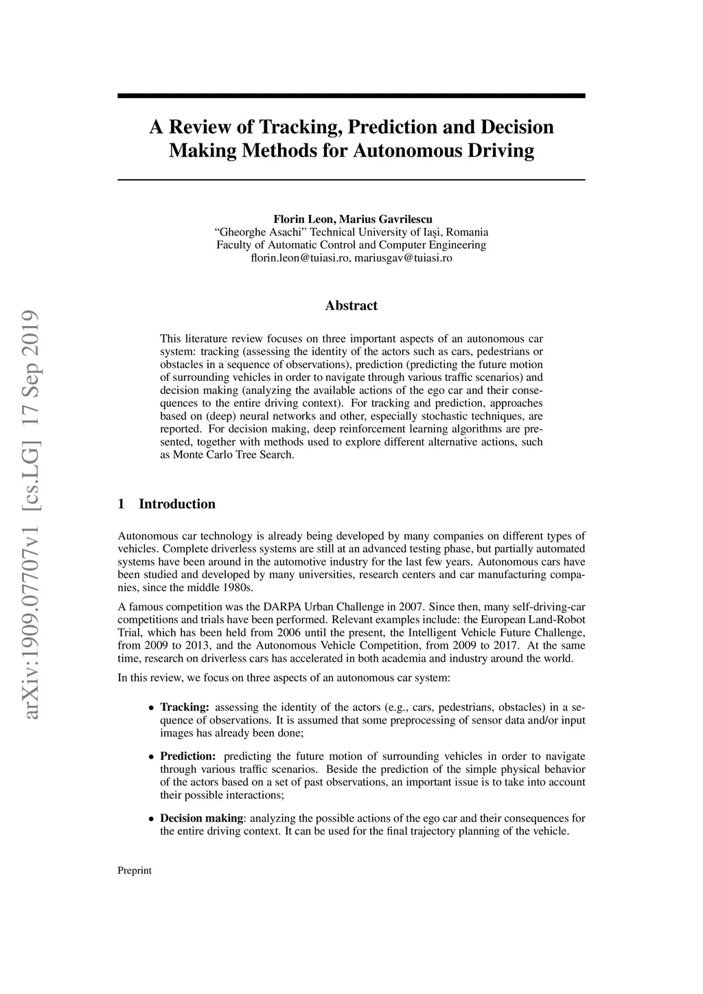 This literature review focuses on three important aspects of an autonomous car system: tracking (assessing the identity of the actors such as cars, pedestrians or obstacles in a sequence of observations), prediction (predicting the future motion of surrounding vehicles in order to navigate through various traffic scenarios) and decision making (analyzing the available actions of the ego car and their consequences to the entire driving context). For tracking and prediction, approaches based on (deep) neural networks and other, especially stochastic techniques, are reported. For decision making, deep reinforcement learning algorithms are presented, together with methods used to explore different alternative actions, such as Monte Carlo Tree Search.