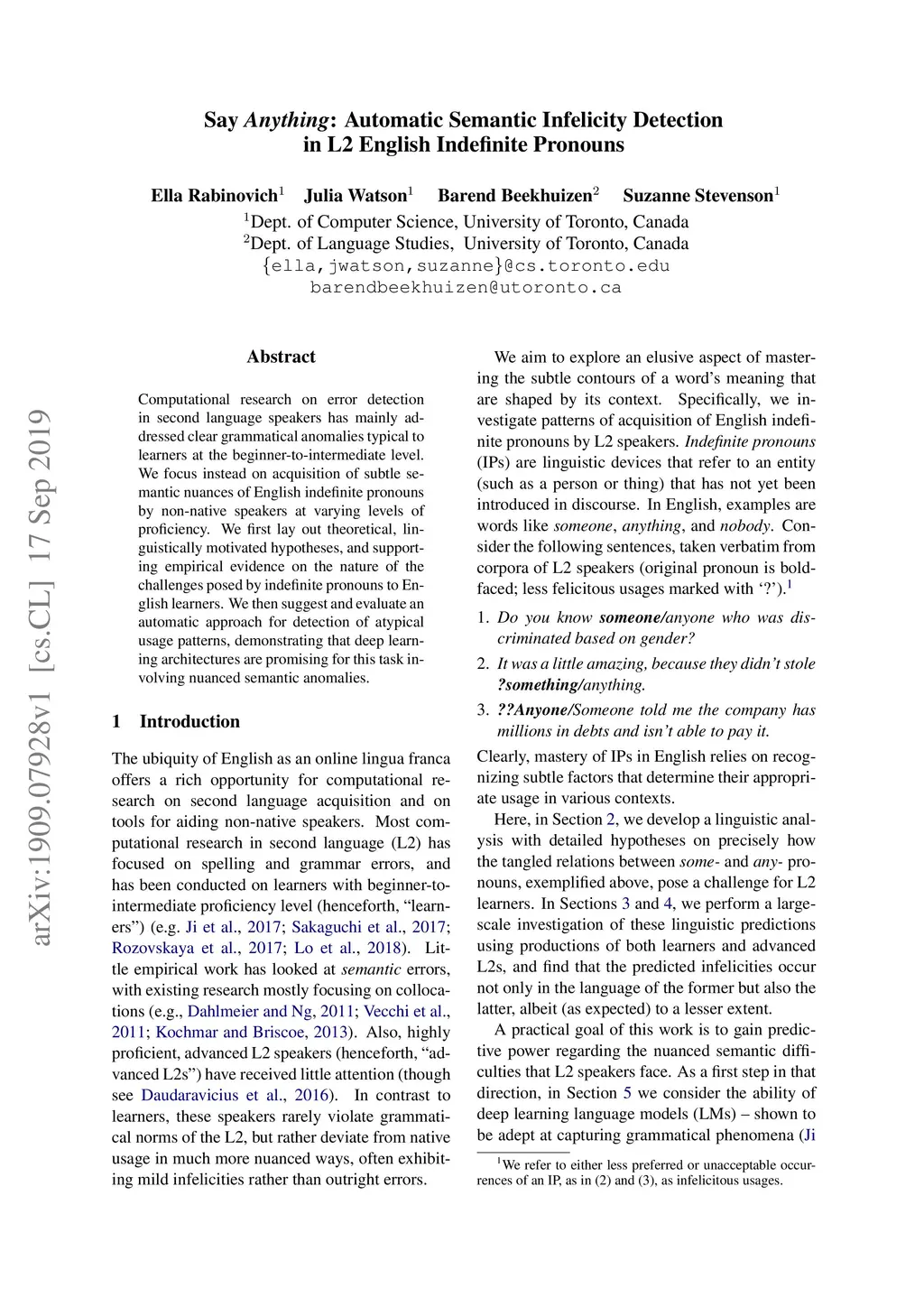 Computational research on error detection in second language speakers has mainly addressed clear grammatical anomalies typical to learners at the beginner-to-intermediate level. We focus instead on acquisition of subtle semantic nuances of English indefinite pronouns by non-native speakers at varying levels of proficiency. We first lay out theoretical, linguistically motivated hypotheses, and supporting empirical evidence on the nature of the challenges posed by indefinite pronouns to English learners. We then suggest and evaluate an automatic approach for detection of atypical usage patterns, demonstrating that deep learning architectures are promising for this task involving nuanced semantic anomalies.