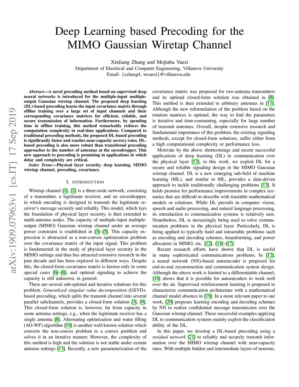 A novel precoding method based on supervised deep neural networks is introduced for the multiple-input multiple-output Gaussian wiretap channel. The proposed deep learning (DL)-based precoding learns the input covariance matrix through offline training over a large set of input channels and their corresponding covariance matrices for efficient, reliable, and secure transmission of information. Furthermore, by spending time in offline training, this method remarkably reduces the computation complexity in real-time applications. Compared to traditional precoding methods, the proposed DL-based precoding is significantly faster and reaches near-capacity secrecy rates. DL-based precoding is also more robust than transitional precoding approaches to the number of antennas at the eavesdropper. This new approach to precoding is promising in applications in which delay and complexity are critical.