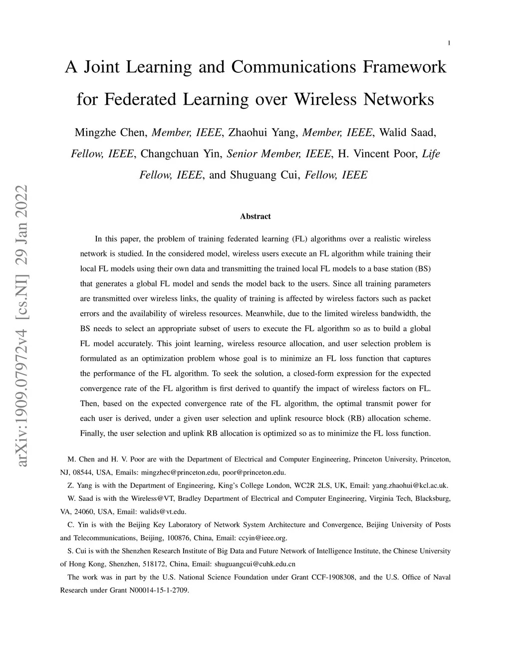 In this paper, the problem of training federated learning (FL) algorithms over a realistic wireless network is studied. In particular, in the considered model, wireless users execute an FL algorithm while training their local FL models using their own data and transmitting the trained local FL models to a base station (BS) that will generate a global FL model and send it back to the users. Since all training parameters are transmitted over wireless links, the quality of the training will be affected by wireless factors such as packet errors and the availability of wireless resources. Meanwhile, due to the limited wireless bandwidth, the BS must select an appropriate subset of users to execute the FL algorithm so as to build a global FL model accurately. This joint learning, wireless resource allocation, and user selection problem is formulated as an optimization problem whose goal is to minimize an FL loss function that captures the performance of the FL algorithm. To address this problem, a closed-form expression for the expected convergence rate of the FL algorithm is first derived to quantify the impact of wireless factors on FL. Then, based on the expected convergence rate of the FL algorithm, the optimal transmit power for each user is derived, under a given user selection and uplink resource block (RB) allocation scheme. Finally, the user selection and uplink RB allocation is optimized so as to minimize the FL loss function. Simulation results show that the proposed joint federated learning and communication framework can reduce the FL loss function value by up to 10% and 16%, respectively, compared to: 1) An optimal user selection algorithm with random resource allocation and 2) a standard FL algorithm with random user selection and resource allocation.