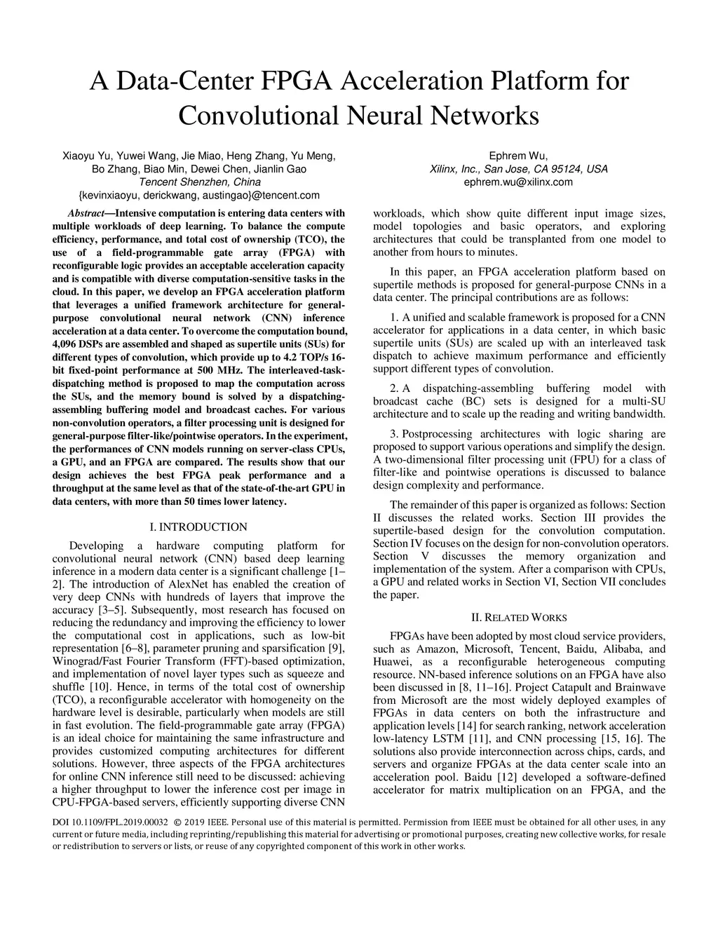 Intensive computation is entering data centers with multiple workloads of deep learning. To balance the compute efficiency, performance, and total cost of ownership (TCO), the use of a field-programmable gate array (FPGA) with reconfigurable logic provides an acceptable acceleration capacity and is compatible with diverse computation-sensitive tasks in the cloud. In this paper, we develop an FPGA acceleration platform that leverages a unified framework architecture for general-purpose convolutional neural network (CNN) inference acceleration at a data center. To overcome the computation bound, 4,096 DSPs are assembled and shaped as supertile units (SUs) for different types of convolution, which provide up to 4.2 TOP/s 16-bit fixed-point performance at 500 MHz. The interleaved-task-dispatching method is proposed to map the computation across the SUs, and the memory bound is solved by a dispatching-assembling buffering model and broadcast caches. For various non-convolution operators, a filter processing unit is designed for general-purpose filter-like/pointwise operators. In the experiment, the performances of CNN models running on server-class CPUs, a GPU, and an FPGA are compared. The results show that our design achieves the best FPGA peak performance and a throughput at the same level as that of the state-of-the-art GPU in data centers, with more than 50 times lower latency.
