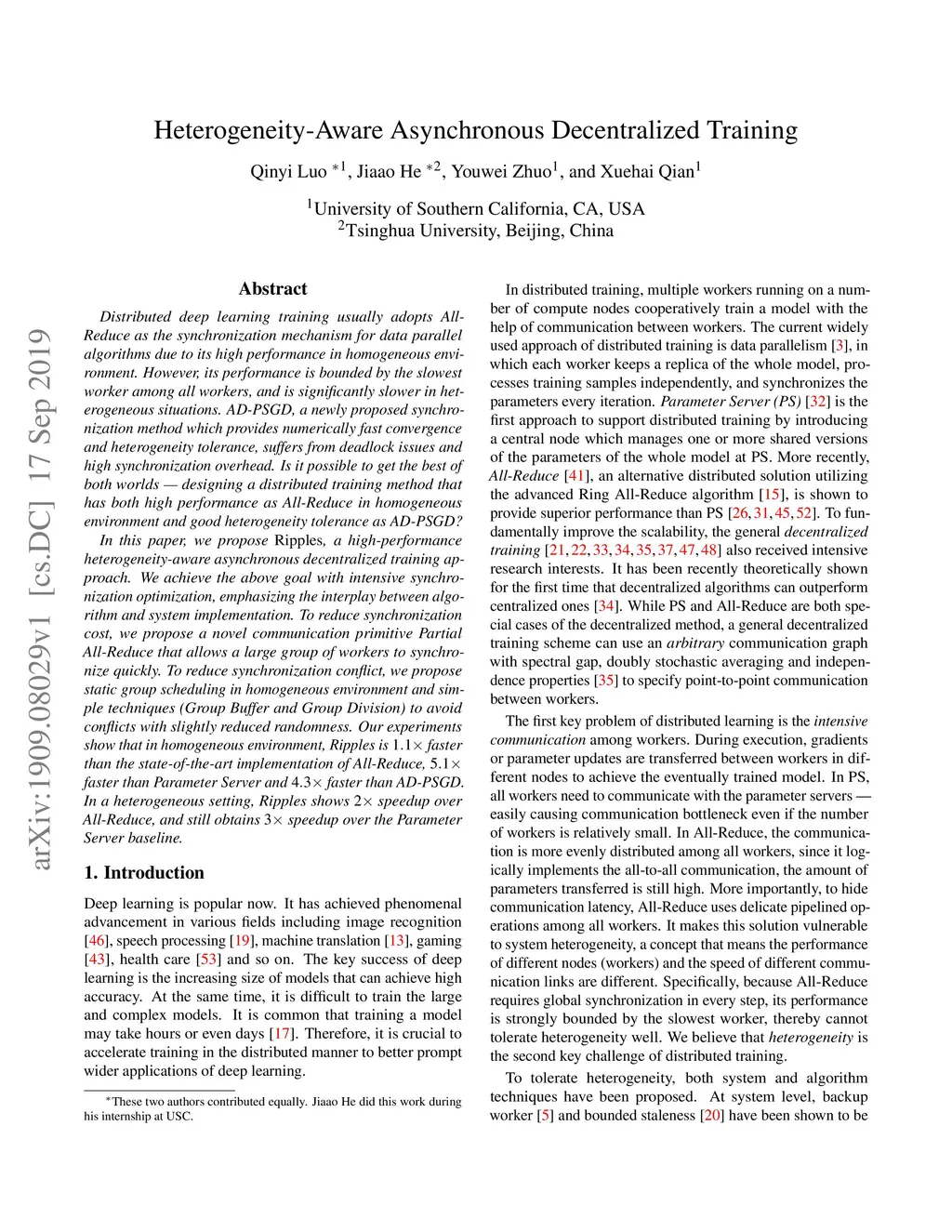 Distributed deep learning training usually adopts All-Reduce as the synchronization mechanism for data parallel algorithms due to its high performance in homogeneous environment. However, its performance is bounded by the slowest worker among all workers, and is significantly slower in heterogeneous situations. AD-PSGD, a newly proposed synchronization method which provides numerically fast convergence and heterogeneity tolerance, suffers from deadlock issues and high synchronization overhead. Is it possible to get the best of both worlds - designing a distributed training method that has both high performance as All-Reduce in homogeneous environment and good heterogeneity tolerance as AD-PSGD? In this paper, we propose Ripples, a high-performance heterogeneity-aware asynchronous decentralized training approach. We achieve the above goal with intensive synchronization optimization, emphasizing the interplay between algorithm and system implementation. To reduce synchronization cost, we propose a novel communication primitive Partial All-Reduce that allows a large group of workers to synchronize quickly. To reduce synchronization conflict, we propose static group scheduling in homogeneous environment and simple techniques (Group Buffer and Group Division) to avoid conflicts with slightly reduced randomness. Our experiments show that in homogeneous environment, Ripples is 1.1 times faster than the state-of-the-art implementation of All-Reduce, 5.1 times faster than Parameter Server and 4.3 times faster than AD-PSGD. In a heterogeneous setting, Ripples shows 2 times speedup over All-Reduce, and still obtains 3 times speedup over the Parameter Server baseline.
