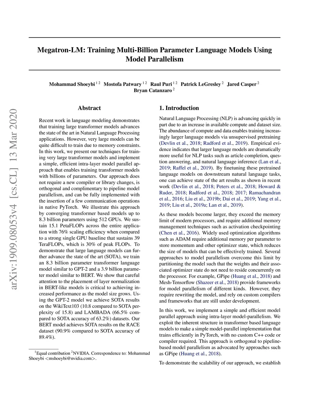 Megatron-LM: Training Multi-Billion Parameter Language Models Using