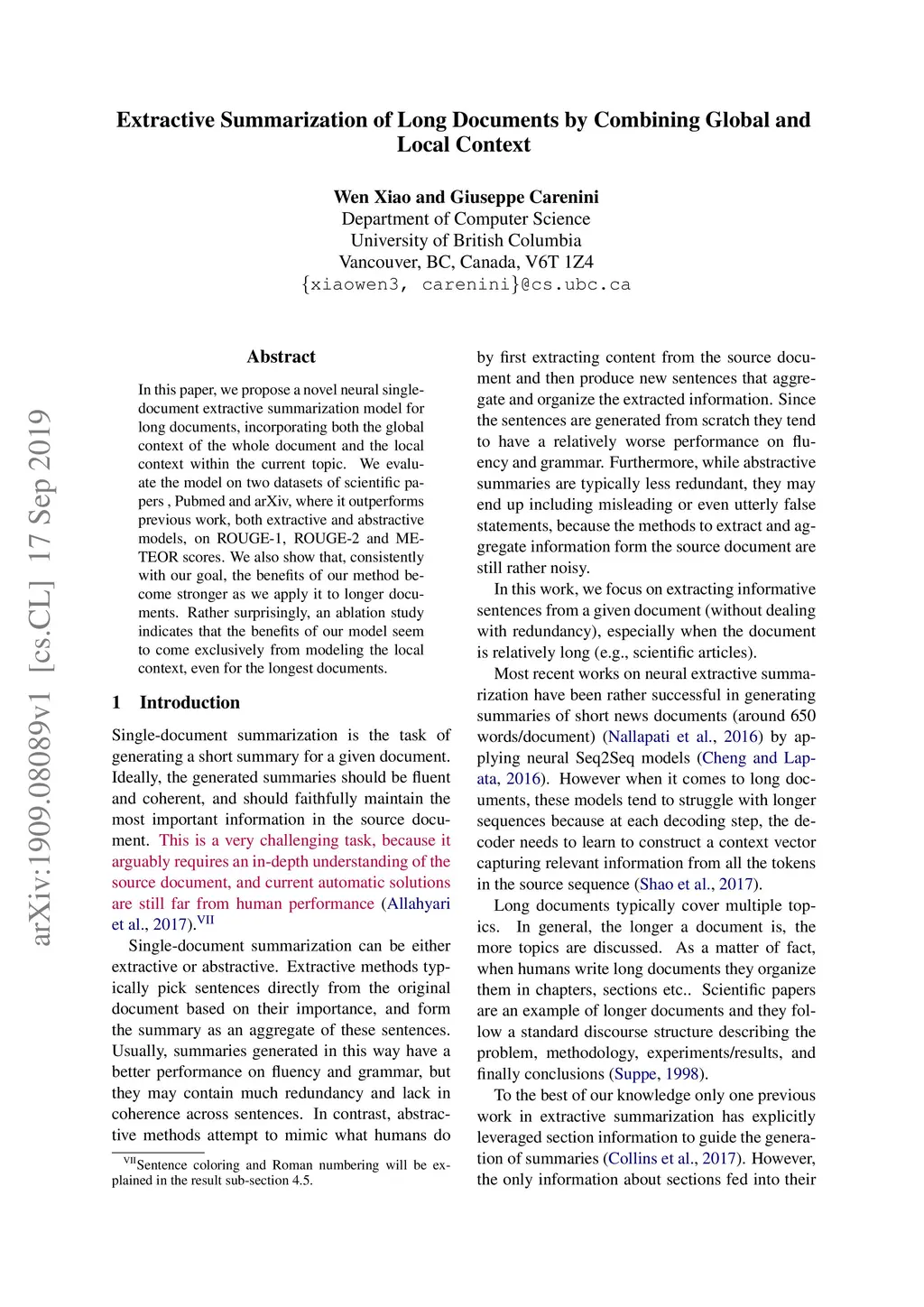 In this paper, we propose a novel neural single document extractive summarization model for long documents, incorporating both the global context of the whole document and the local context within the current topic. We evaluate the model on two datasets of scientific papers, Pubmed and arXiv, where it outperforms previous work, both extractive and abstractive models, on ROUGE-1, ROUGE-2 and METEOR scores. We also show that, consistently with our goal, the benefits of our method become stronger as we apply it to longer documents. Rather surprisingly, an ablation study indicates that the benefits of our model seem to come exclusively from modeling the local context, even for the longest documents.
