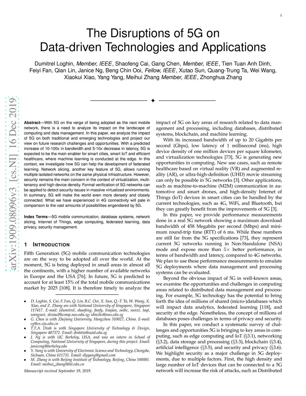 With 5G on the verge of being adopted as the next mobile network, there is a need to analyze its impact on the landscape of computing and data management. In this paper, we analyze the impact of 5G on both traditional and emerging technologies and project our view on future research challenges and opportunities. With a predicted increase of 10-100x in bandwidth and 5-10x decrease in latency, 5G is expected to be the main enabler for smart cities, smart IoT and efficient healthcare, where machine learning is conducted at the edge. In this context, we investigate how 5G can help the development of federated learning. Network slicing, another key feature of 5G, allows running multiple isolated networks on the same physical infrastructure. However, security remains the main concern in the context of virtualization, multi-tenancy and high device density. Formal verification of 5G networks can be applied to detect security issues in massive virtualized environments. In summary, 5G will make the world even more densely and closely connected. What we have experienced in 4G connectivity will pale in comparison to the vast amounts of possibilities engendered by 5G.