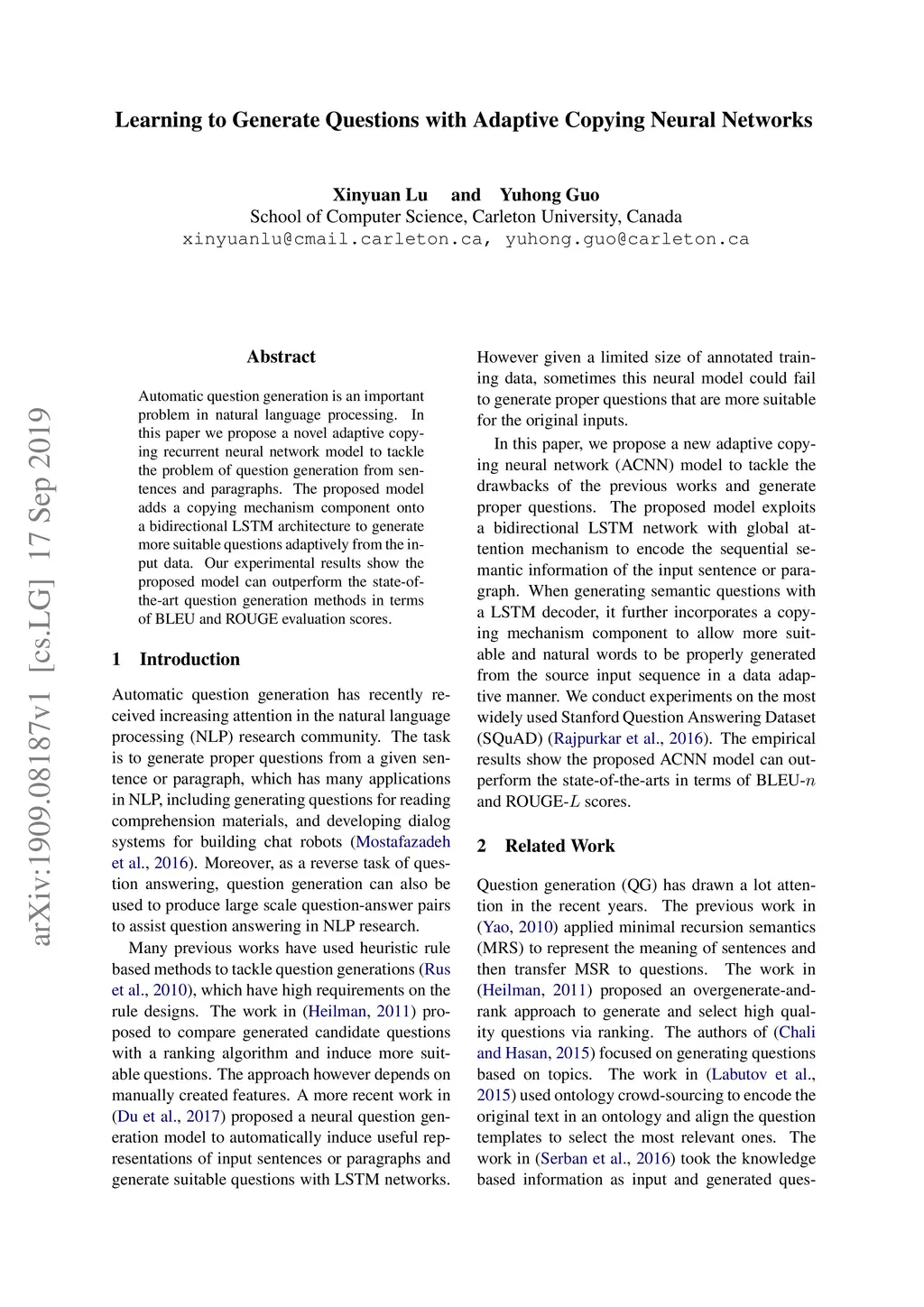 Learning to Generate Questions with Adaptive Copying Neural Networks