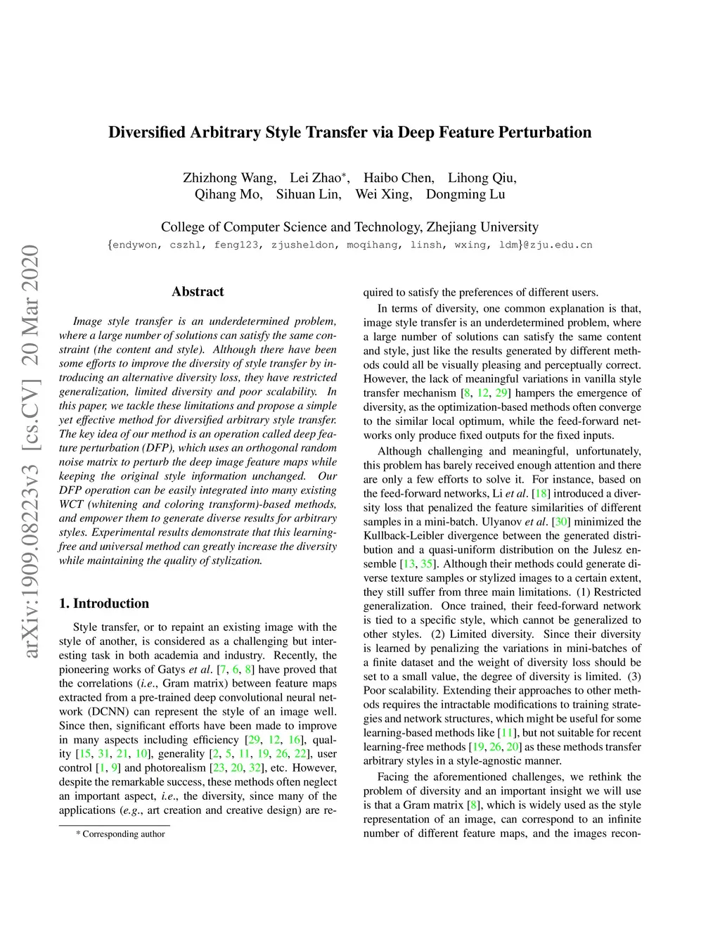 Diversified Arbitrary Style Transfer via Deep Feature Perturbation