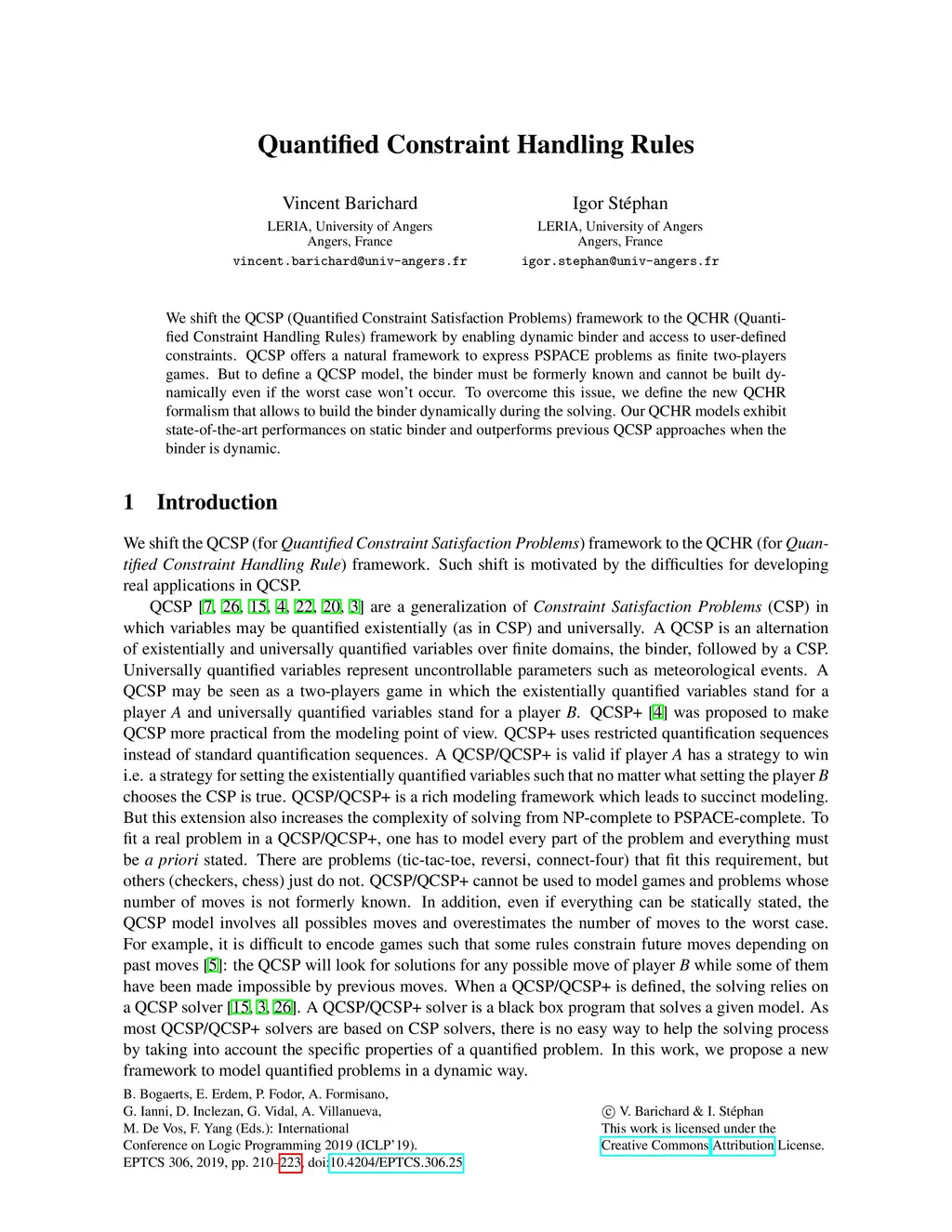 We shift the QCSP (Quantified Constraint Satisfaction Problems) framework to the QCHR (Quantified Constraint Handling Rules) framework by enabling dynamic binder and access to user-defined constraints. QCSP offers a natural framework to express PSPACE problems as finite two-players games. But to define a QCSP model, the binder must be formerly known and cannot be built dynamically even if the worst case won't occur. To overcome this issue, we define the new QCHR formalism that allows to build the binder dynamically during the solving. Our QCHR models exhibit state-of-the-art performances on static binder and outperforms previous QCSP approaches when the binder is dynamic.