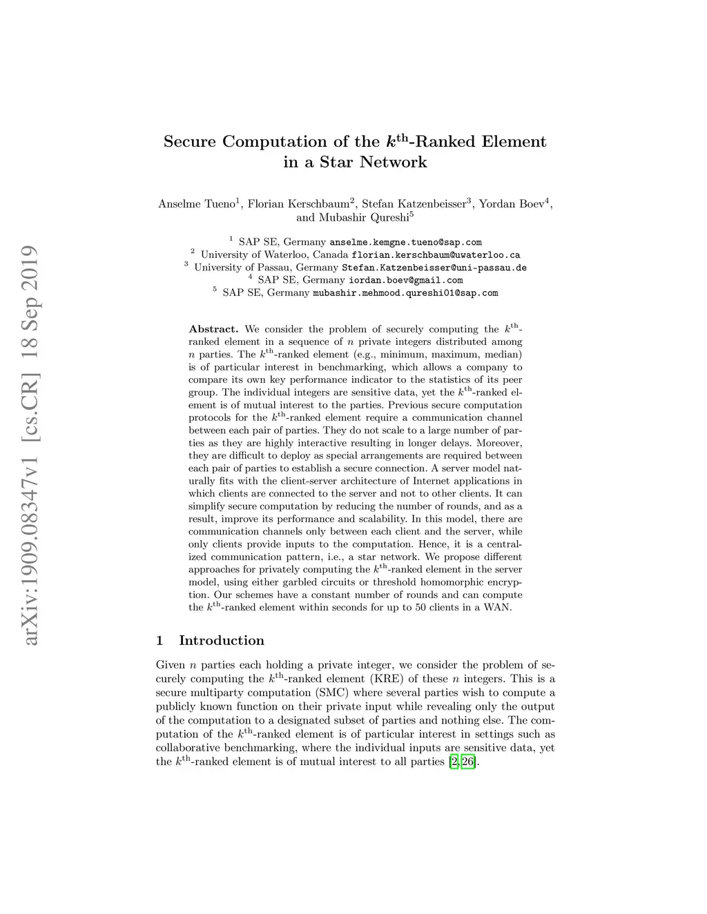 We consider the problem of securely computing the kth-ranked element in a sequence of n private integers distributed among n parties. The kth-ranked element (e.g., minimum, maximum, median) is of particular interest in benchmarking, which allows a company to compare its own key performance indicator to the statistics of its peer group. The individual integers are sensitive data, yet the kth-ranked element is of mutual interest to the parties. Previous secure computation protocols for the kth-ranked element require a communication channel between each pair of parties. They do not scale to a large number of parties as they are highly interactive resulting in longer delays. Moreover, they are difficult to deploy as special arrangements are required between each pair of parties to establish a secure connection. A server model naturally fits with the client-server architecture of Internet applications in which clients are connected to the server and not to other clients. It can simplify secure computation by reducing the number of rounds, and as a result, improve its performance and scalability. In this model, there are communication channels only between each client and the server, while only clients provide inputs to the computation. Hence, it is a centralized communication pattern, i.e., a star network. We propose different approaches for privately computing the kth-ranked element in the server model, using either garbled circuits or threshold homomorphic encryption. Our schemes have a constant number of rounds and can compute the kth-ranked element within seconds for up to 50 clients in a WAN.