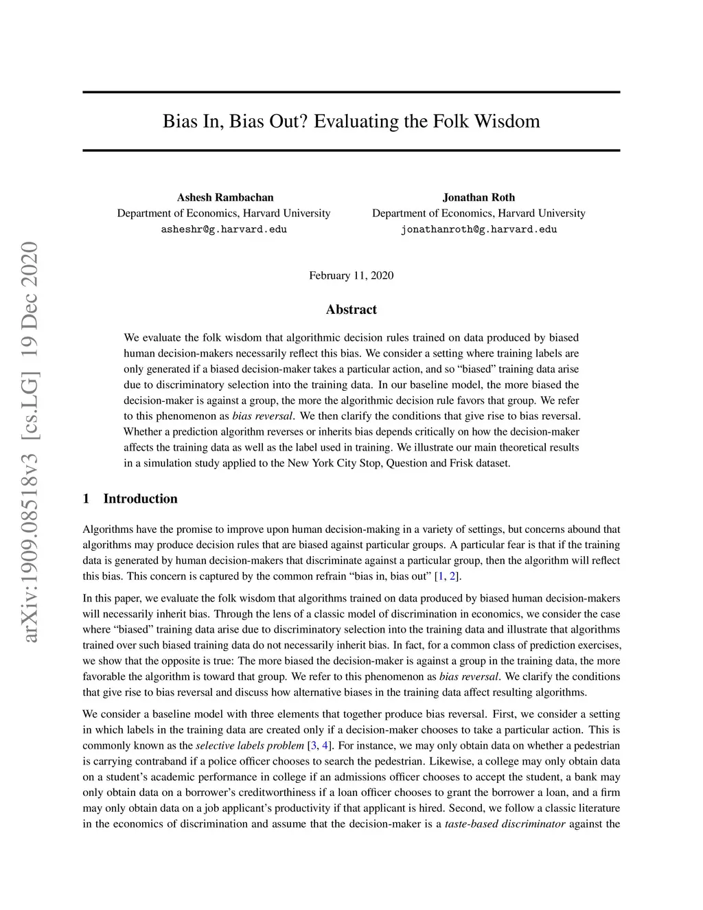 We evaluate the folk wisdom that algorithmic decision rules trained on data produced by biased human decision-makers necessarily reflect this bias. We consider a setting where training labels are only generated if a biased decision-maker takes a particular action, and so "biased" training data arise due to discriminatory selection into the training data. In our baseline model, the more biased the decision-maker is against a group, the more the algorithmic decision rule favors that group. We refer to this phenomenon as "bias reversal." We then clarify the conditions that give rise to bias reversal. Whether a prediction algorithm reverses or inherits bias depends critically on how the decision-maker affects the training data as well as the label used in training. We illustrate our main theoretical results in a simulation study applied to the New York City Stop, Question and Frisk dataset.