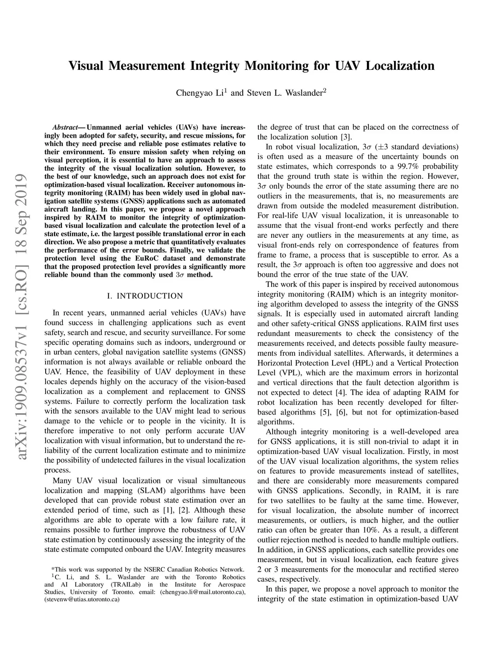 Unmanned aerial vehicles (UAVs) have increasingly been adopted for safety, security, and rescue missions, for which they need precise and reliable pose estimates relative to their environment. To ensure mission safety when relying on visual perception, it is essential to have an approach to assess the integrity of the visual localization solution. However, to the best of our knowledge, such an approach does not exist for optimization-based visual localization. Receiver autonomous integrity monitoring (RAIM) has been widely used in global navigation satellite systems (GNSS) applications such as automated aircraft landing. In this paper, we propose a novel approach inspired by RAIM to monitor the integrity of optimization-based visual localization and calculate the protection level of a state estimate, i.e. the largest possible translational error in each direction. We also propose a metric that quantitatively evaluates the performance of the error bounds. Finally, we validate the protection level using the EuRoC dataset and demonstrate that the proposed protection level provides a significantly more reliable bound than the commonly used method.