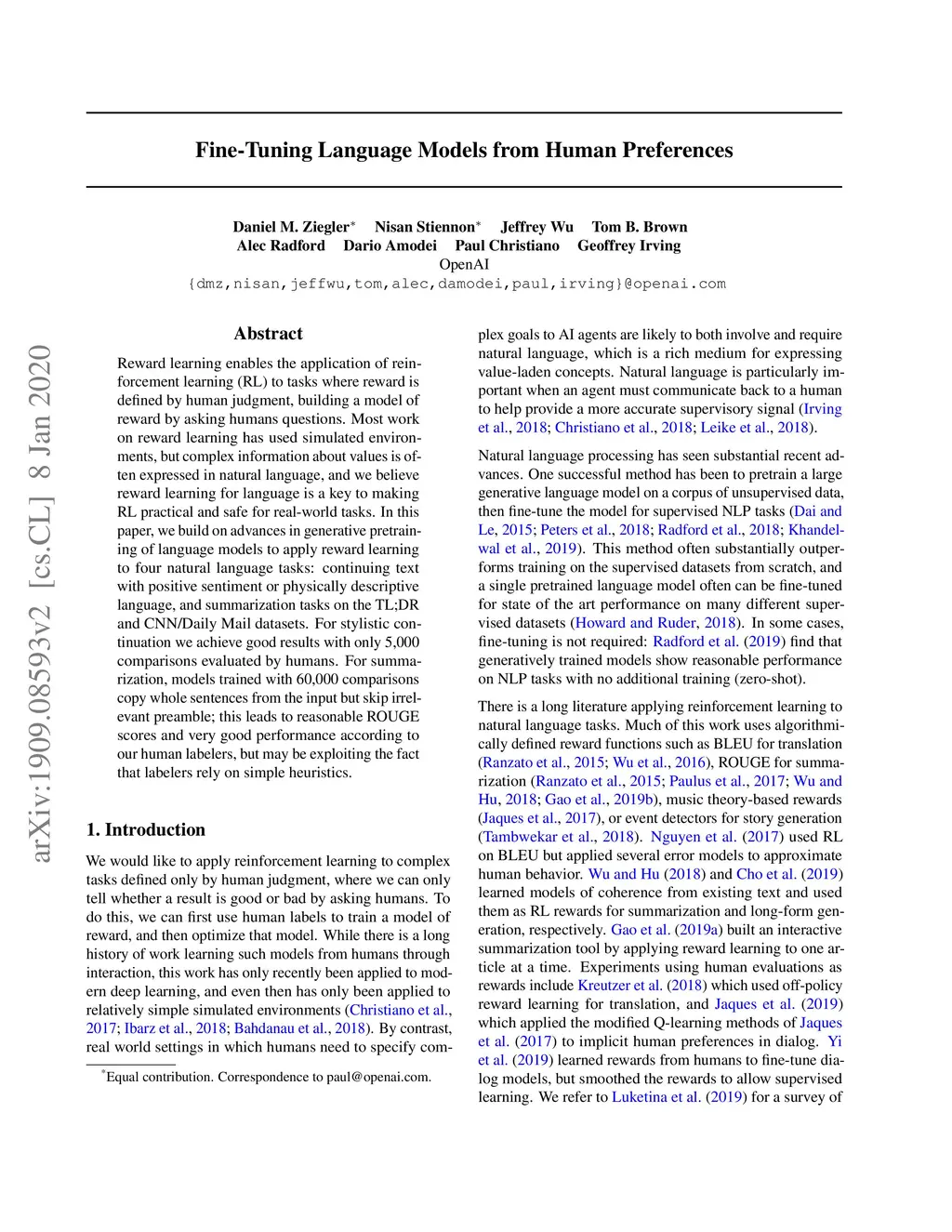 Reward learning enables the application of reinforcement learning (RL) to tasks where reward is defined by human judgment, building a model of reward by asking humans questions. Most work on reward learning has used simulated environments, but complex information about values is often expressed in natural language, and we believe reward learning for language is a key to making RL practical and safe for real-world tasks. In this paper, we build on advances in generative pretraining of language models to apply reward learning to four natural language tasks: continuing text with positive sentiment or physically descriptive language, and summarization tasks on the TL;DR and CNN/Daily Mail datasets. For stylistic continuation we achieve good results with only 5,000 comparisons evaluated by humans. For summarization, models trained with 60,000 comparisons copy whole sentences from the input but skip irrelevant preamble; this leads to reasonable ROUGE scores and very good performance according to our human labelers, but may be exploiting the fact that labelers rely on simple heuristics.