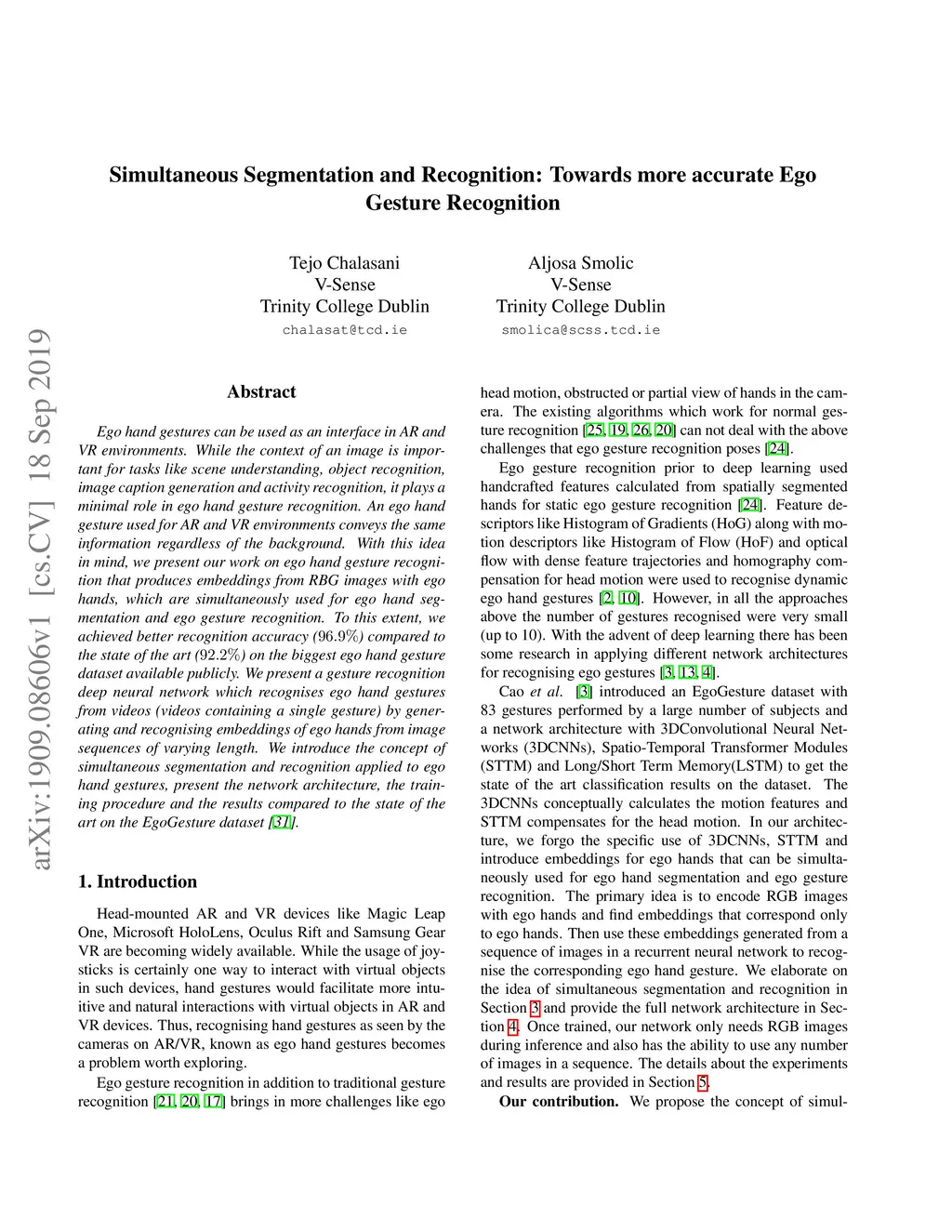 Ego hand gestures can be used as an interface in AR and VR environments. While the context of an image is important for tasks like scene understanding, object recognition, image caption generation and activity recognition, it plays a minimal role in ego hand gesture recognition. An ego hand gesture used for AR and VR environments conveys the same information regardless of the background. With this idea in mind, we present our work on ego hand gesture recognition that produces embeddings from RBG images with ego hands, which are simultaneously used for ego hand segmentation and ego gesture recognition. To this extent, we achieved better recognition accuracy (96.9%) compared to the state of the art (92.2%) on the biggest ego hand gesture dataset available publicly. We present a gesture recognition deep neural network which recognises ego hand gestures from videos (videos containing a single gesture) by generating and recognising embeddings of ego hands from image sequences of varying length. We introduce the concept of simultaneous segmentation and recognition applied to ego hand gestures, present the network architecture, the training procedure and the results compared to the state of the art on the EgoGesture dataset