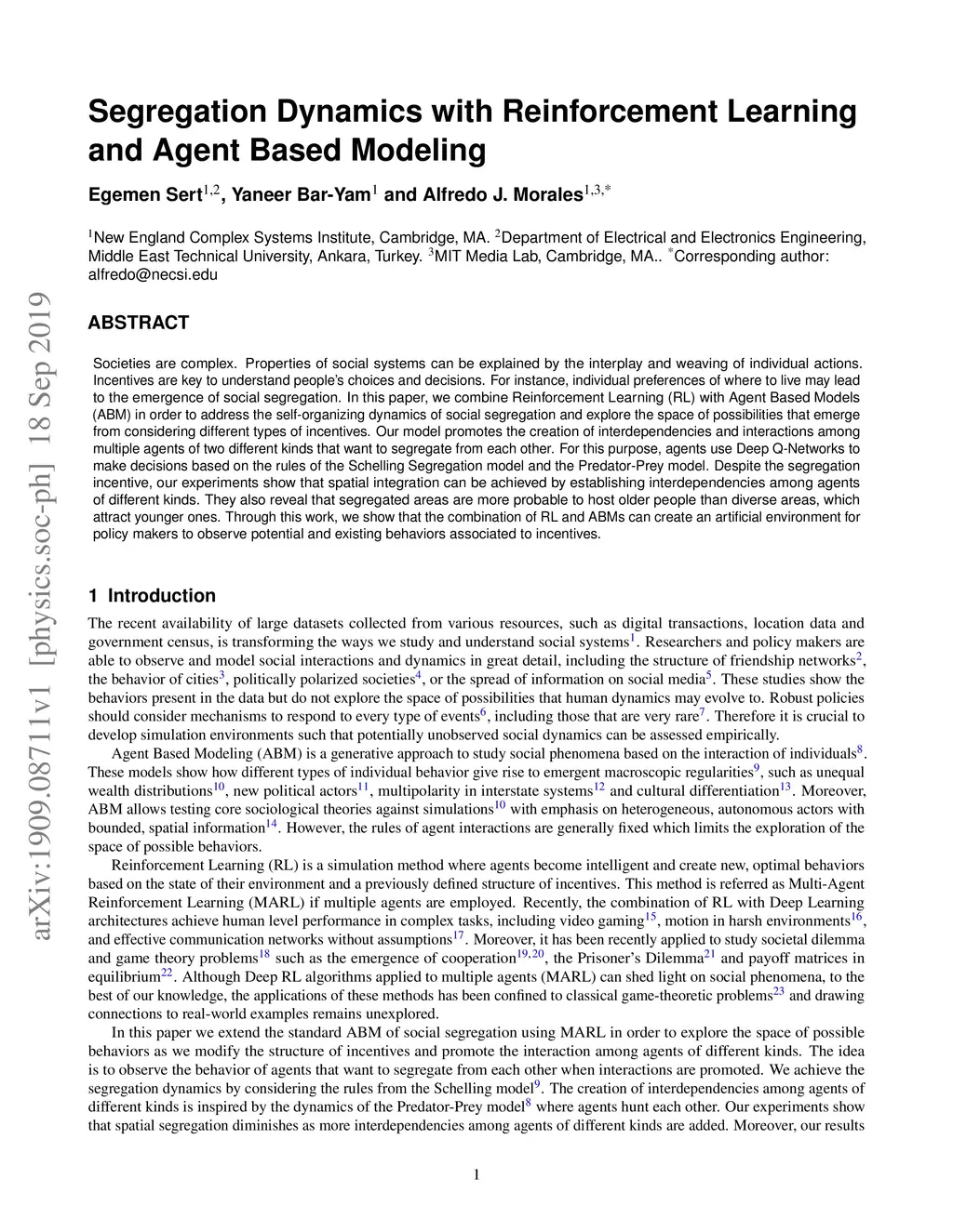 Societies are complex. Properties of social systems can be explained by the interplay and weaving of individual actions. Incentives are key to understand people's choices and decisions. For instance, individual preferences of where to live may lead to the emergence of social segregation. In this paper, we combine Reinforcement Learning (RL) with Agent Based Models (ABM) in order to address the self-organizing dynamics of social segregation and explore the space of possibilities that emerge from considering different types of incentives. Our model promotes the creation of interdependencies and interactions among multiple agents of two different kinds that want to segregate from each other. For this purpose, agents use Deep Q-Networks to make decisions based on the rules of the Schelling Segregation model and the Predator-Prey model. Despite the segregation incentive, our experiments show that spatial integration can be achieved by establishing interdependencies among agents of different kinds. They also reveal that segregated areas are more probable to host older people than diverse areas, which attract younger ones. Through this work, we show that the combination of RL and ABMs can create an artificial environment for policy makers to observe potential and existing behaviors associated to incentives.