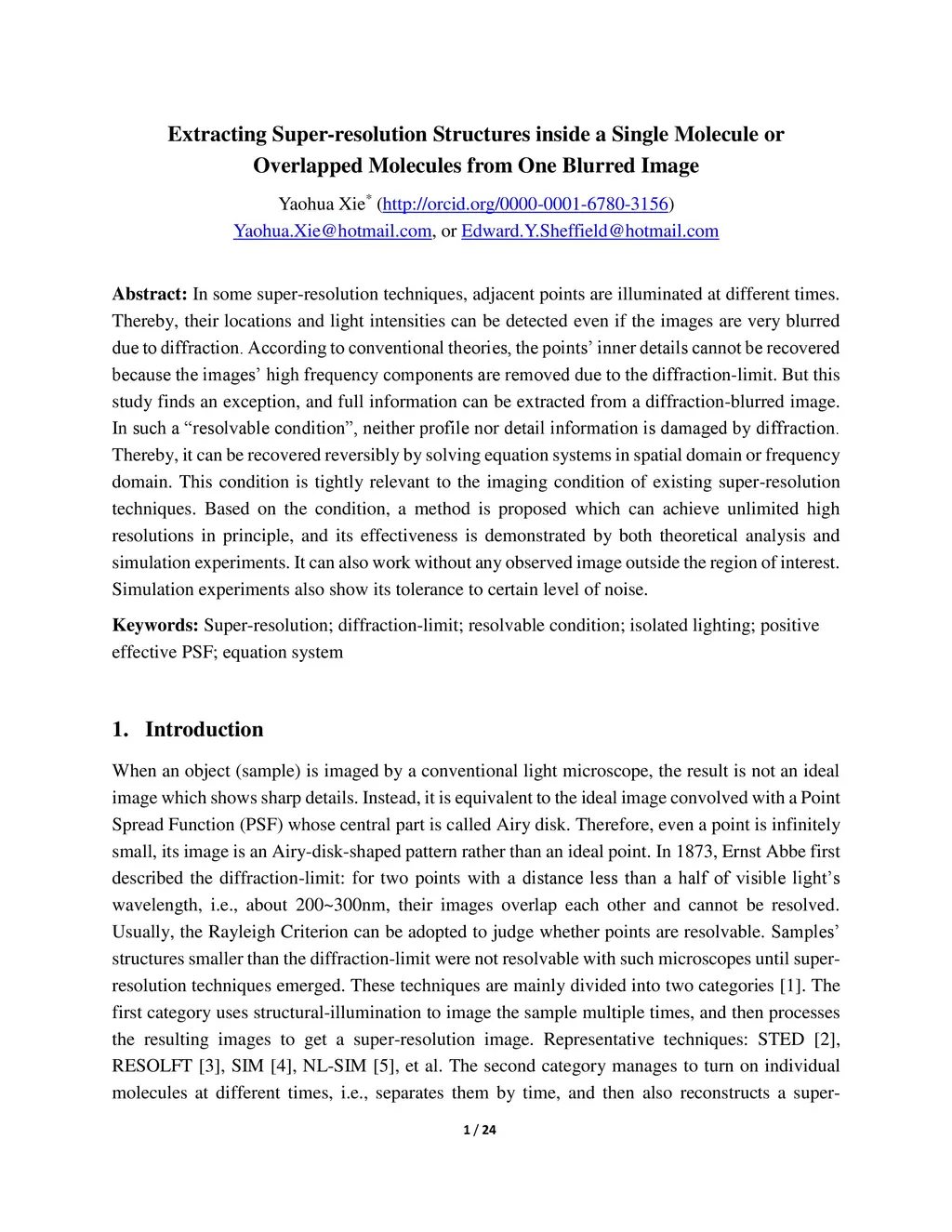 In some super-resolution techniques, adjacent points are illuminated at different times. Thereby, their locations and light intensities can be detected even if the images are very blurred due to diffraction. According to conventional theories, the points' inner details cannot be recovered because the images' high frequency components are removed due to the diffraction-limit. But this study finds an exception, and full information can be extracted from a diffraction-blurred image. In such a "resolvable condition", neither profile nor detail information is damaged by diffraction. Thereby, it can be recovered reversibly by solving equation systems in spatial domain or frequency domain. This condition is tightly relevant to the imaging condition of existing super-resolution techniques. Based on the condition, a method is proposed which can achieve unlimited high resolutions in principle, and its effectiveness is demonstrated by both theoretical analysis and simulation experiments. It can also work without any observed image outside the region of interest. Simulation experiments also show its tolerance to certain level of noise.