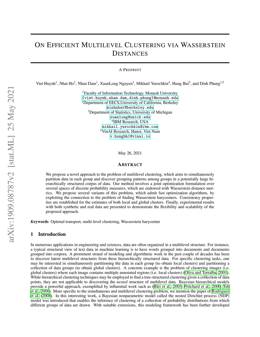 On Efficient Multilevel Clustering via Wasserstein Distances