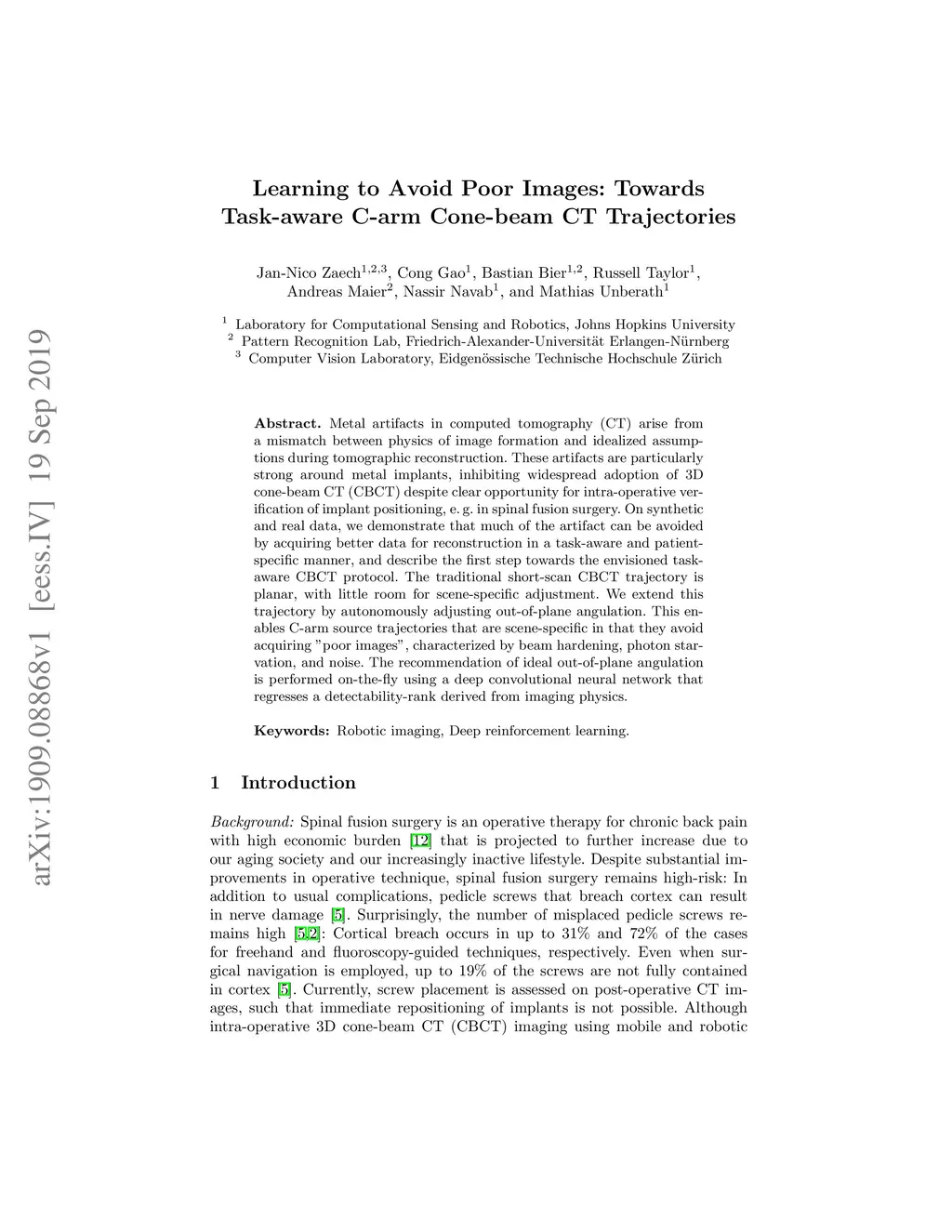 Metal artifacts in computed tomography (CT) arise from a mismatch between physics of image formation and idealized assumptions during tomographic reconstruction. These artifacts are particularly strong around metal implants, inhibiting widespread adoption of 3D cone-beam CT (CBCT) despite clear opportunity for intra-operative verification of implant positioning, e.g. in spinal fusion surgery. On synthetic and real data, we demonstrate that much of the artifact can be avoided by acquiring better data for reconstruction in a task-aware and patient-specific manner, and describe the first step towards the envisioned task-aware CBCT protocol. The traditional short-scan CBCT trajectory is planar, with little room for scene-specific adjustment. We extend this trajectory by autonomously adjusting out-of-plane angulation. This enables C-arm source trajectories that are scene-specific in that they avoid acquiring "poor images", characterized by beam hardening, photon starvation, and noise. The recommendation of ideal out-of-plane angulation is performed on-the-fly using a deep convolutional neural network that regresses a detectability-rank derived from imaging physics.