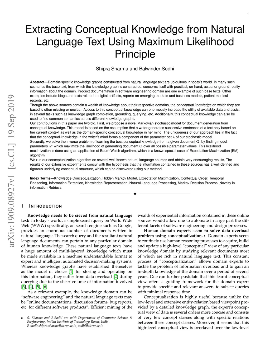 Domain-specific knowledge graphs constructed from natural language text are ubiquitous in today's world. In many such scenarios the base text, from which the knowledge graph is constructed, concerns itself with practical, on-hand, actual or ground-reality information about the domain. Product documentation in software engineering domain are one example of such base texts. Other examples include blogs and texts related to digital artifacts, reports on emerging markets and business models, patient medical records, etc. Though the above sources contain a wealth of knowledge about their respective domains, the conceptual knowledge on which they are based is often missing or unclear. Access to this conceptual knowledge can enormously increase the utility of available data and assist in several tasks such as knowledge graph completion, grounding, querying, etc. Our contributions in this paper are twofold. First, we propose a novel Markovian stochastic model for document generation from conceptual knowledge. The uniqueness of our approach lies in the fact that the conceptual knowledge in the writer's mind forms a component of the parameter set of our stochastic model. Secondly, we solve the inverse problem of learning the best conceptual knowledge from a given document, by finding model parameters which maximize the likelihood of generating the specific document over all possible parameter values. This likelihood maximization is done using an application of Baum-Welch algorithm, which is a known special case of Expectation-Maximization (EM) algorithm. We run our conceptualization algorithm on several well-known natural language sources and obtain very encouraging results. The results of our extensive experiments concur with the hypothesis that the information contained in these sources has a well-defined and rigorous underlying conceptual structure, which can be discovered using our method.