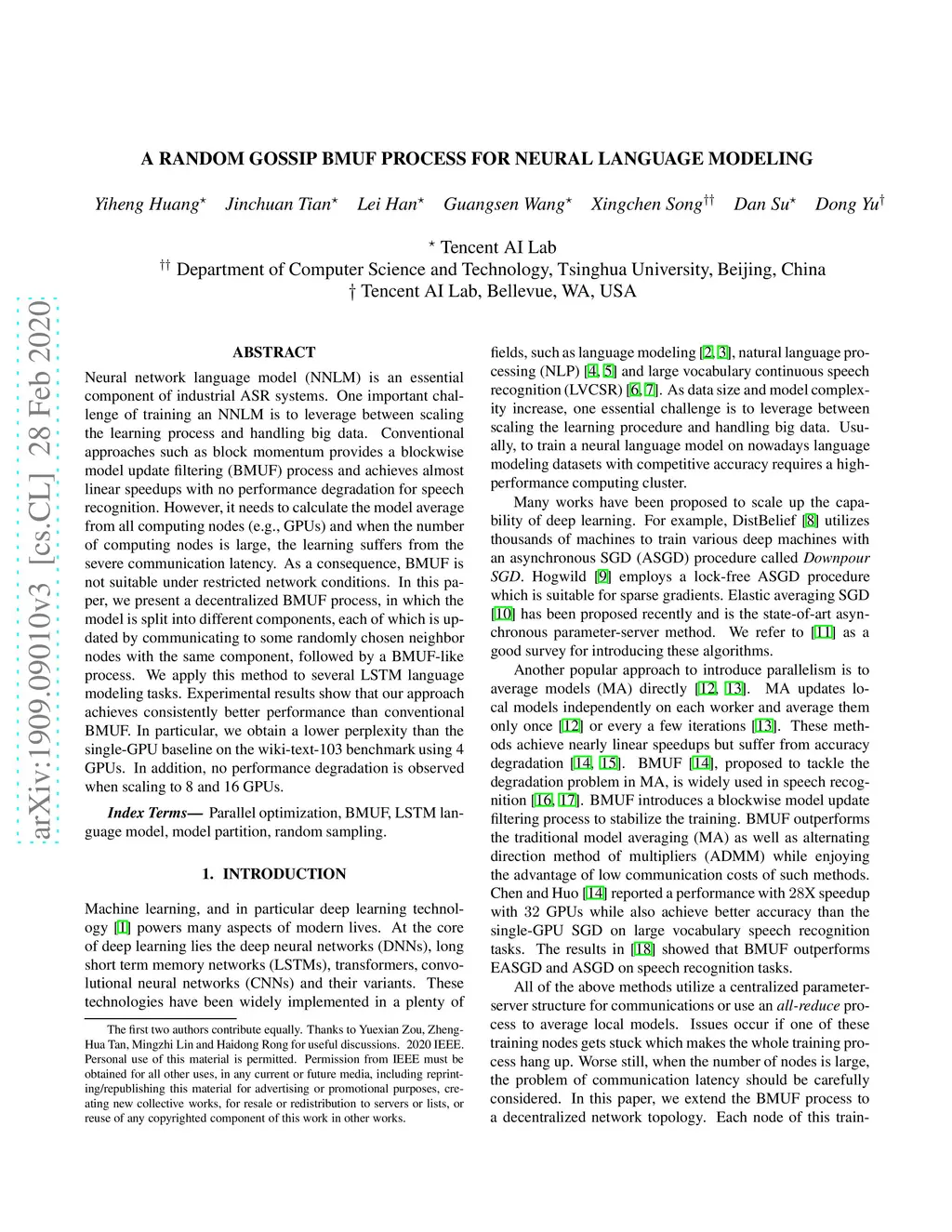 Neural network language model (NNLM) is an essential component of industrial ASR systems. One important challenge of training an NNLM is to leverage between scaling the learning process and handling big data. Conventional approaches such as block momentum provides a blockwise model update filtering (BMUF) process and achieves almost linear speedups with no performance degradation for speech recognition. However, it needs to calculate the model average from all computing nodes (e.g., GPUs) and when the number of computing nodes is large, the learning suffers from the severe communication latency. As a consequence, BMUF is not suitable under restricted network conditions. In this paper, we present a decentralized BMUF process, in which the model is split into different components, each of which is updated by communicating to some randomly chosen neighbor nodes with the same component, followed by a BMUF-like process. We apply this method to several LSTM language modeling tasks. Experimental results show that our approach achieves consistently better performance than conventional BMUF. In particular, we obtain a lower perplexity than the single-GPU baseline on the wiki-text-103 benchmark using 4 GPUs. In addition, no performance degradation is observed when scaling to 8 and 16 GPUs.