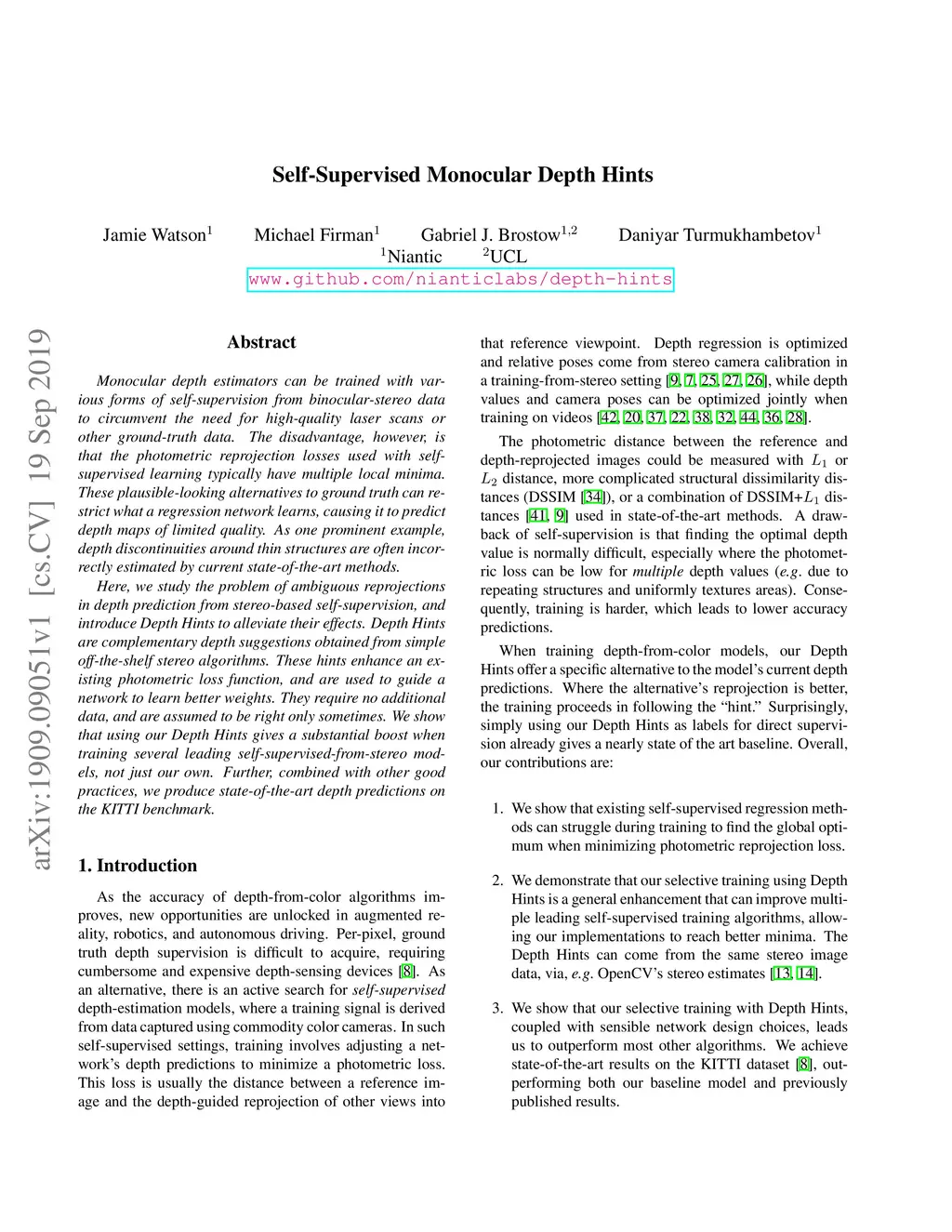 Monocular depth estimators can be trained with various forms of self-supervision from binocular-stereo data to circumvent the need for high-quality laser scans or other ground-truth data. The disadvantage, however, is that the photometric reprojection losses used with self-supervised learning typically have multiple local minima. These plausible-looking alternatives to ground truth can restrict what a regression network learns, causing it to predict depth maps of limited quality. As one prominent example, depth discontinuities around thin structures are often incorrectly estimated by current state-of-the-art methods. Here, we study the problem of ambiguous reprojections in depth prediction from stereo-based self-supervision, and introduce Depth Hints to alleviate their effects. Depth Hints are complementary depth suggestions obtained from simple off-the-shelf stereo algorithms. These hints enhance an existing photometric loss function, and are used to guide a network to learn better weights. They require no additional data, and are assumed to be right only sometimes. We show that using our Depth Hints gives a substantial boost when training several leading self-supervised-from-stereo models, not just our own. Further, combined with other good practices, we produce state-of-the-art depth predictions on the KITTI benchmark.
