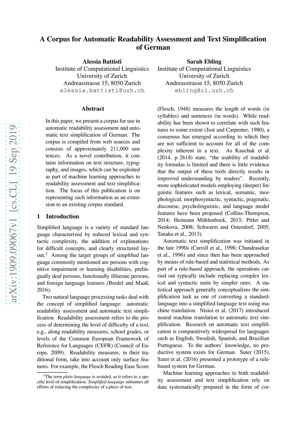 In this paper, we present a corpus for use in automatic readability assessment and automatic text simplification of German. The corpus is compiled from web sources and consists of approximately 211,000 sentences. As a novel contribution, it contains information on text structure, typography, and images, which can be exploited as part of machine learning approaches to readability assessment and text simplification. The focus of this publication is on representing such information as an extension to an existing corpus standard.