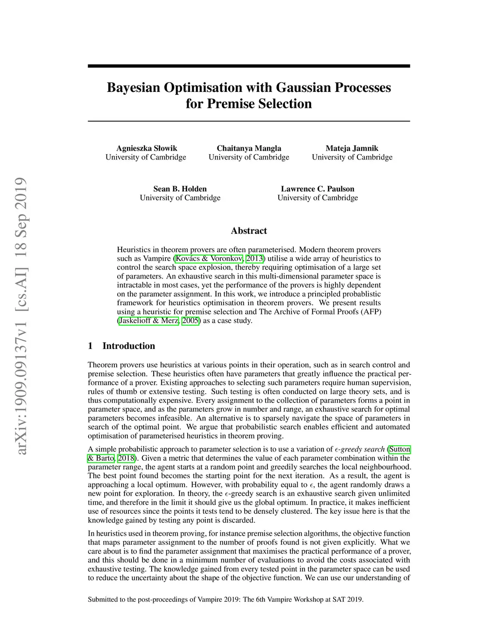Heuristics in theorem provers are often parameterised. Modern theorem provers such as Vampire utilise a wide array of heuristics to control the search space explosion, thereby requiring optimisation of a large set of parameters. An exhaustive search in this multi-dimensional parameter space is intractable in most cases, yet the performance of the provers is highly dependent on the parameter assignment. In this work, we introduce a principled probablistic framework for heuristics optimisation in theorem provers. We present results using a heuristic for premise selection and The Archive of Formal Proofs (AFP) as a case study.