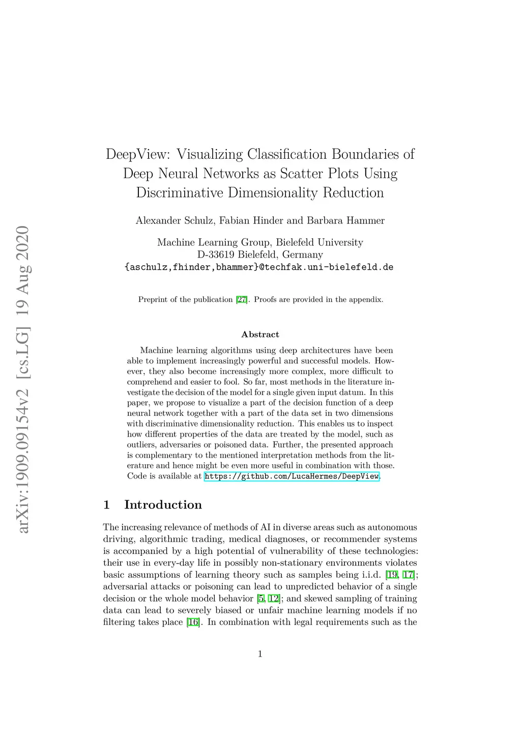 Machine learning models using deep architectures have been able to implement increasingly powerful and successful models. However, they also become increasingly more complex, more difficult to comprehend and easier to fool. So far, mostly methods have been proposed to investigate the decision of the model for a single given input datum. In this paper, we propose to visualize a part of the decision function of a deep neural network together with a part of the data set in two dimensions with discriminative dimensionality reduction. This enables us to inspect how different properties of the data are treated by the model, such as multimodality, label noise or biased data. Further, the presented approach is complementary to the mentioned interpretation methods from the literature and hence might be even more useful in combination with those.